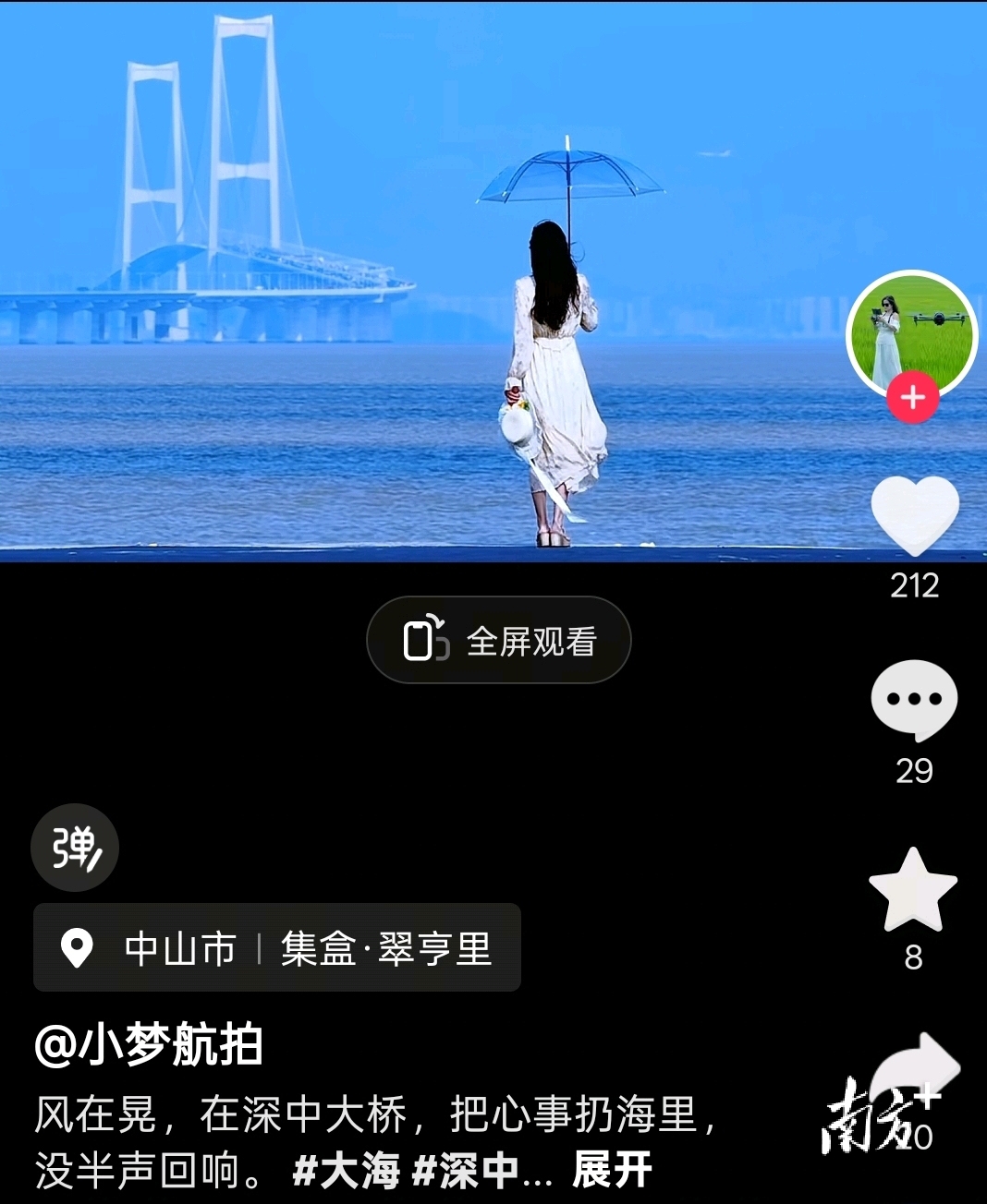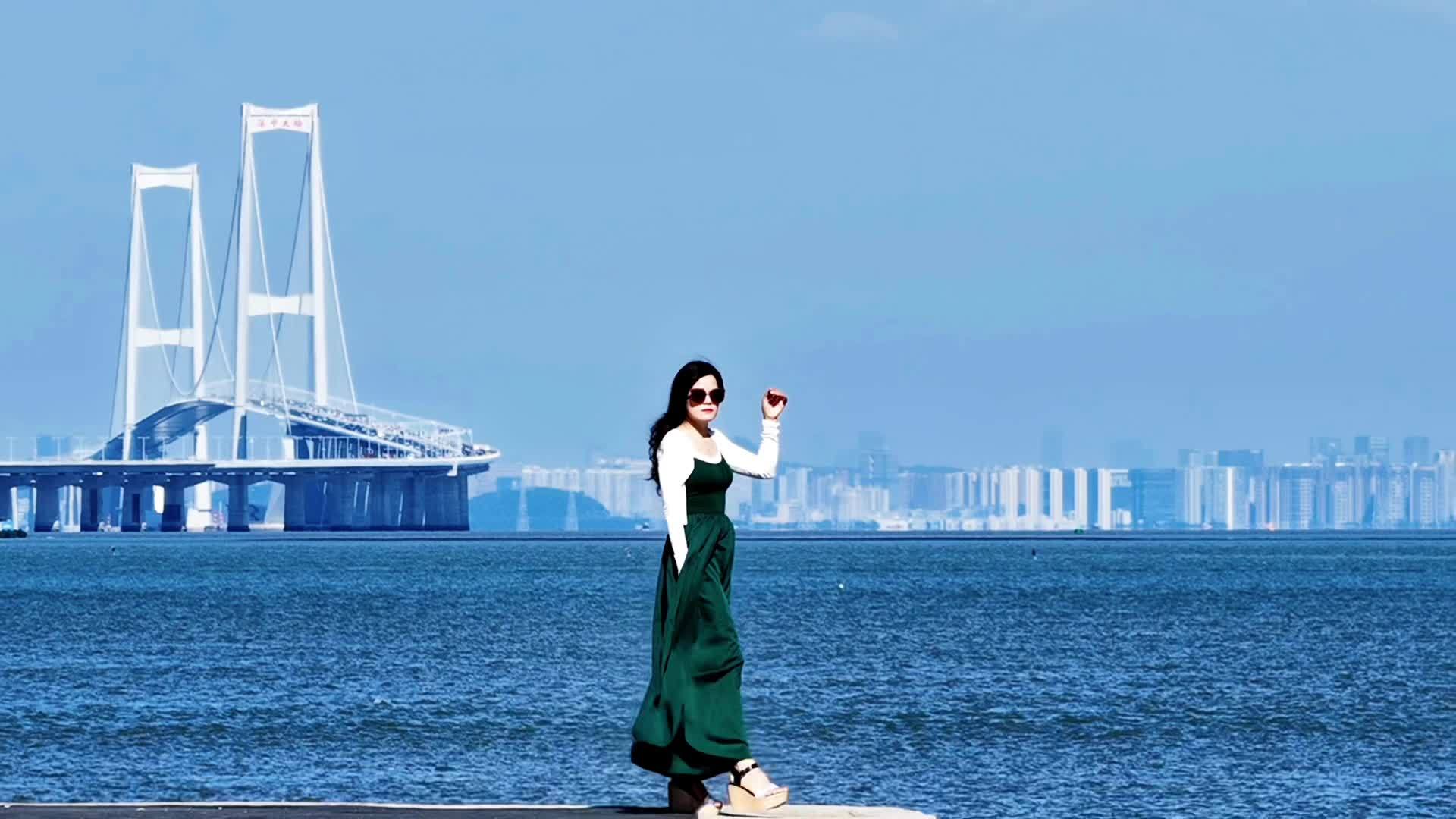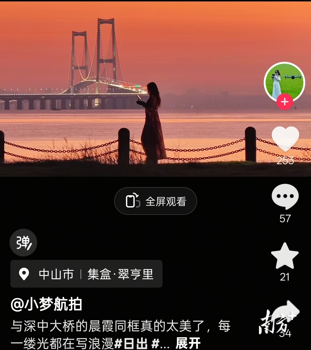 今年5月,热衷户外爬山的小梦,新购入了一架无人机,成为中山摄影发烧友中的“女飞手”。5月13日,小梦随手发布了一段无人机拍摄的深中通道视频,视频中的人物站在堤坝旁,随着镜头移动,缓缓展现出背后的深中大桥和湛蓝海面。