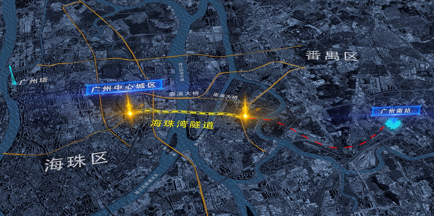 海珠湾隧道是由广州交投集团投资建设,铁四院设计、中铁十四局施工的广州首条超大直径盾构隧道,设计时速60公里。其中盾构段长2102米,最大开挖直径达15.07米,以双管盾构隧道形式下穿三枝香水道、洛溪岛、珠江沥滘水道,是广州第一条超大直径盾构隧道,是广州城市隧道建设史上首个超大直径盾构工程,被誉为“广州第一盾”。