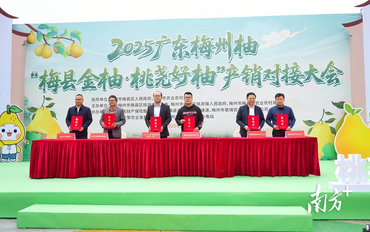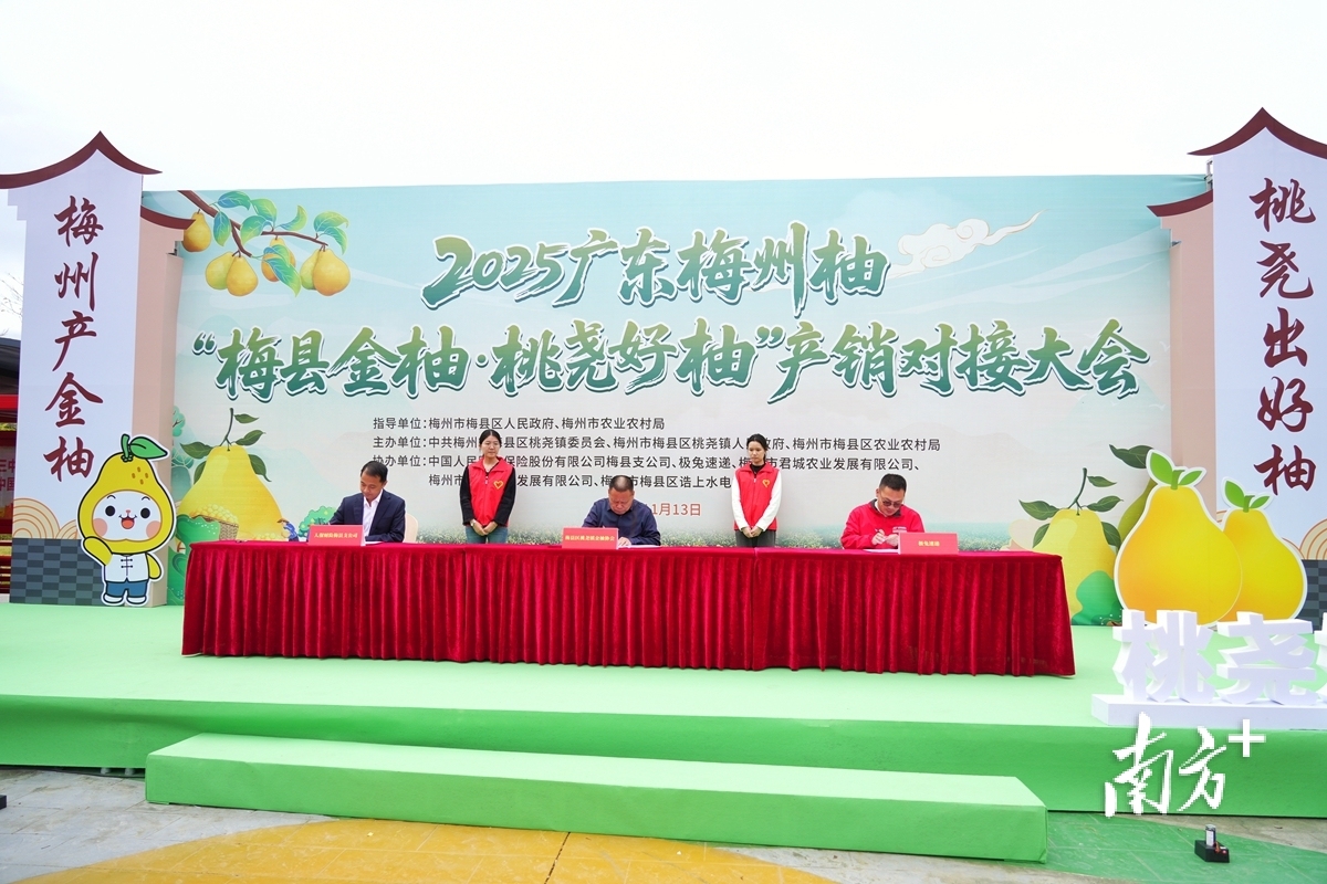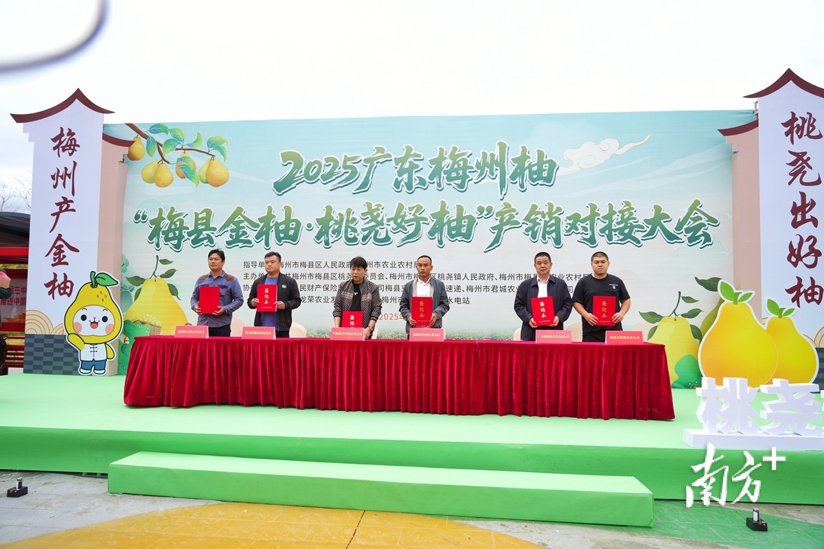 此次活动举行了系列签约、启动仪式。其中,6家“桃尧好柚”种植经营户与6家采购商进行销售签约,分别为:君城农业发展有限公司与“百千万工程”帮扶协作驻梅县区工作队,粤佳农业发展有限公司与中国邮政集团有限公司梅州市分公司,梅州市梅县区桃尧镇金柚协会与梅州市梅县区金柚协会,梅州市龙荣农业发展有限公司与平和县步步发农业有限公司,梅州市凯润农业有限公司与广东畲穗丝苗米农业发展有限公司,梅州市梅县区桃尧圆柚园家庭农场与梅州市梅县区金兑农业有限公司。极兔速递、中国人民财产保险公司梅县支公司与梅州市梅县区桃尧镇金柚协会签订物流保障、保险护航金柚产业发展战略合作框架协议。