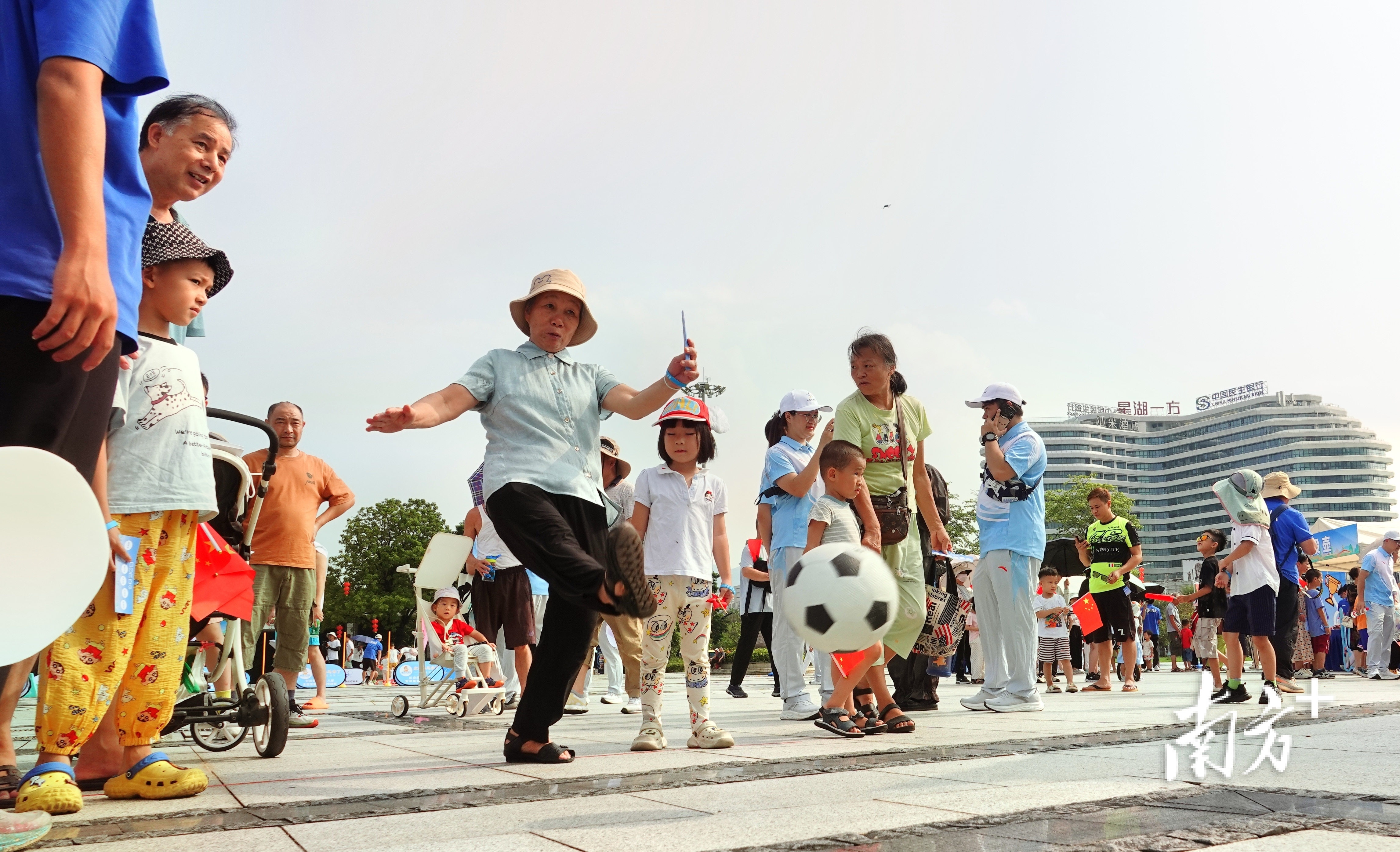 在肇庆,“活力肇庆运动嘉年华”在当地超人气景点七星岩东门广场举行。毽球挑战、足球射门、少儿跑酷、投篮比拼、全运知识问答、趣味投壶,吸引男女老少参与。