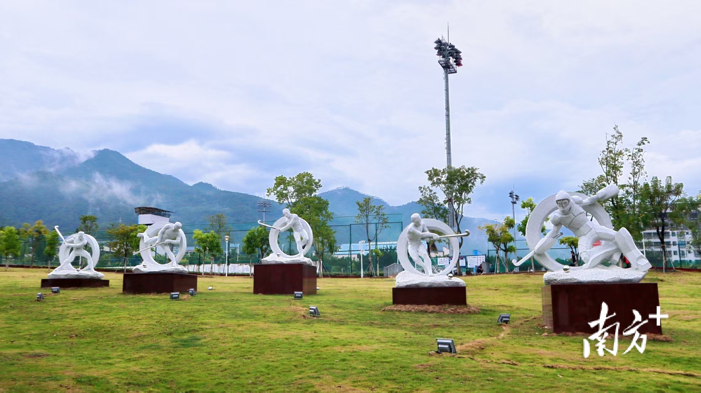 又如,将承办十五运会曲棍球项目的云浮,最近上演了一场云浮石艺非遗与曲棍球的巧妙融合:《石乡曲韵》系列九座曲棍球运动石雕亮相,其中七座精准定格曲棍球的关键瞬间:控球、抢球、发球、运球、传球、击球、守门,更有一座放大的巨型曲棍球体。另一座则是巨型曲棍“球”,位于云浮新落成的曲棍球场入口。