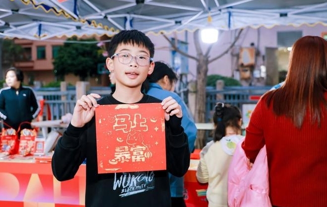 舞台上表演如火如荼,舞台下的新春墟市同样人流如潮、烟火气十足。本土小吃摊前香气四溢,唤醒了不少人的味蕾记忆;弹珠游戏摊位前,大人小孩围聚一团,在欢声笑语中共拾童年乐趣;文创摊位的潮玩设计充满创意,吸引年轻人驻足打卡;在拓印、挥春等传统文化体验区,笔墨间承载着对新春的美好祝愿。