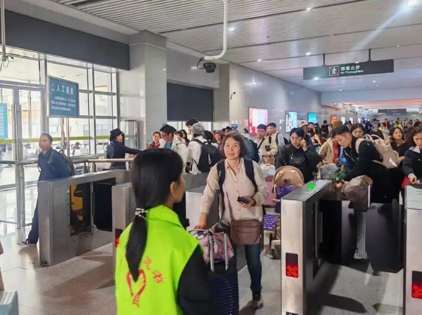 为应对客流增长,广汕铁路公司协同委托运输单位,通过动车组重联、动态加开临客、开行夜间高铁等方式保障运力,沿线各站联动交通部门加密高峰时段公交频次,志愿者贴心提供咨询引导、重点群体帮扶等服务,打通旅客出行“最后一公里”。