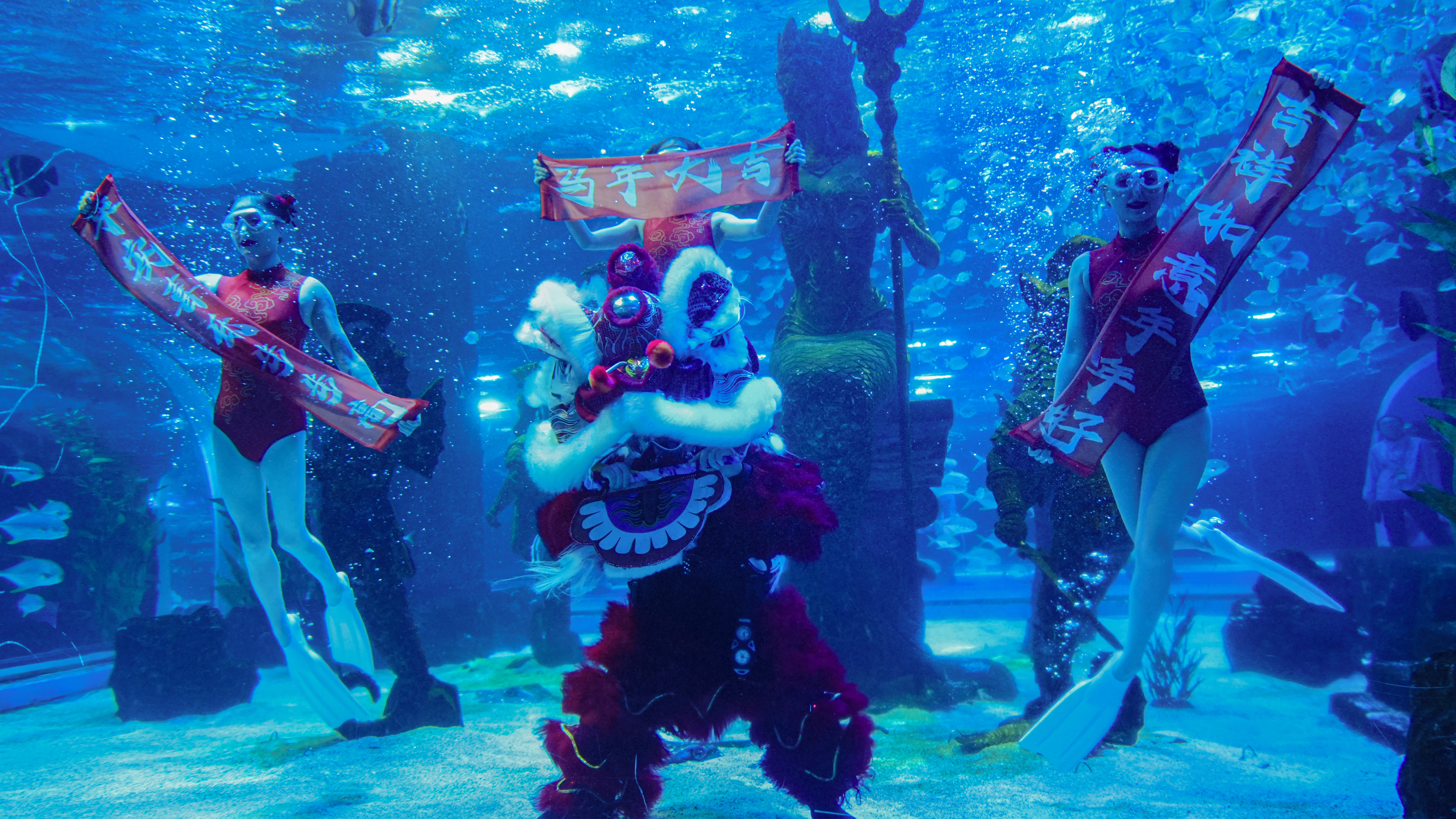 世界首创3D全息光影海豚秀解锁全新新年剧本,特邀国际歌唱家倾情献唱,打造如临演唱会现场的沉浸式视听享受;水舞秀惊喜推出海底舞狮新春限定版,表演者身着国风服饰在水下演绎传统舞狮,刚柔并济的动作将年味习俗与艺术美感完美融合。