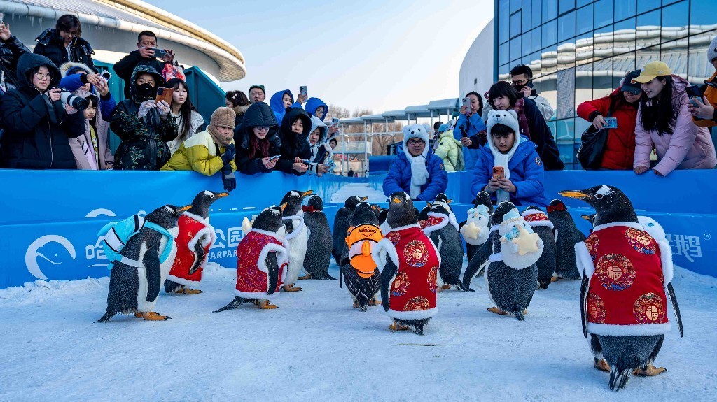 小企鹅们身着红色唐装焕新登场,步履整齐的巡游队伍将新春喜庆氛围推向高潮,极地萌趣与中国红的碰撞,让这场企鹅巡游成为冰城新春独有的视觉盛景,也让冰雪文旅IP的魅力在新春中持续释放。