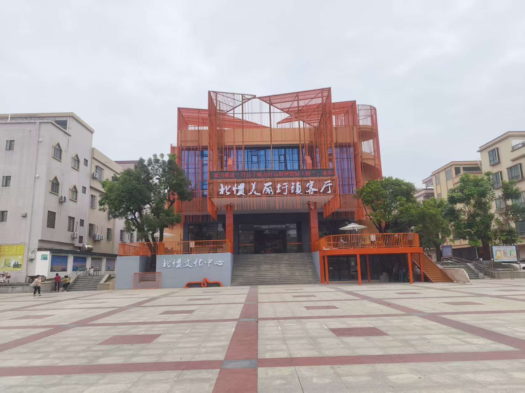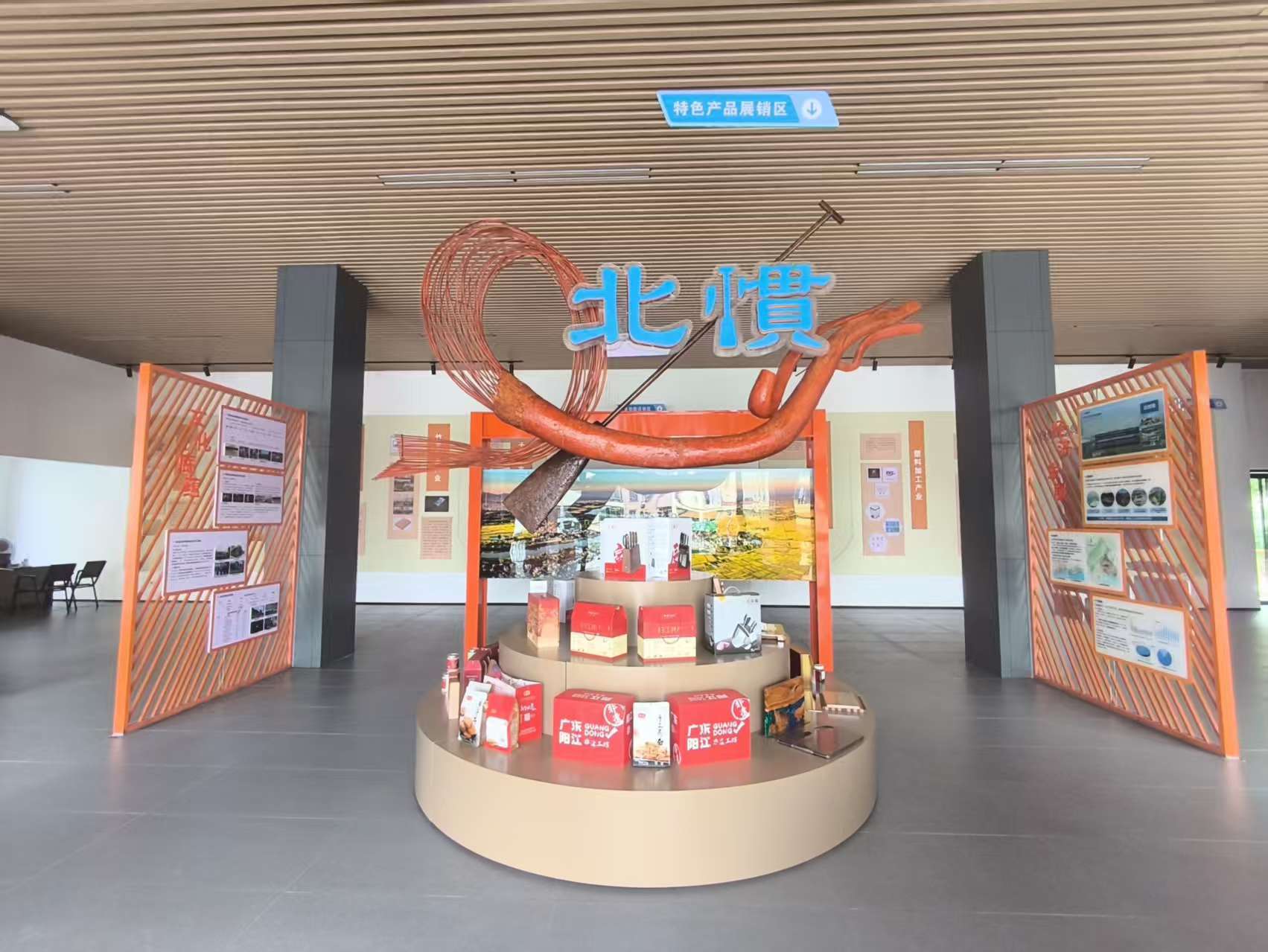 北惯镇美丽圩镇客厅位于北惯镇文化中心一、二楼,这张北惯“新名片”屹立在城乡之间,一改往日的普通建筑风格,暖橙色的饱满色调,配合线条感十足的外型设计,让人初次邂逅便眼前一亮。步入室内,顶部醒目的“北惯”标识与龙舟模型率先映入眼帘。龙舟既承载着北惯人与那龙河相伴的历史记忆,也象征着全镇在高质量发展中如龙舟竞渡,奋勇向前。模型下方陈列着粤森牛大力、王麻子刀具等特色产品,展现着本土产业的蓬勃活力。客厅整体功能齐全,涵盖1400平方米现代化展厅、1000平方米会议室和2000平方米娱乐广场,可满足各类活动需求。其中,一楼集历史沿革、文化展示、规划解读与休闲娱乐于一体,设有休闲座椅与电视,播放北惯镇推进“百千万工程”的纪实故事;二楼非遗展览室则聚焦文化传承与产品展销,鱼篓、邮箱、龙舟等老物件静静陈列,诉说着北惯的民俗文化与生活记忆。