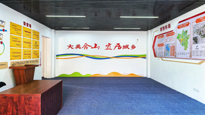 合山镇美丽圩镇客厅由原房管所200平方米空间改造而成,既是展示合山岁月的窗口,也是连接乡土与外界的桥梁。步入客厅,可见莲塘古驿城遗址照片与汤显祖《莲塘驿》诗句相映,引人遥想昔日驿路繁华;西朝村古民居影像与钟氏宗祠的雕梁画栋,无声诉说着百年村落与宗族的荣光。尤为引人注目的是合山“牛”文化展区——全省三大活牛交易市场之一的丰垌牛圩热闹场景,配以白切牛、牛杂粥等黄牛宴图片,勾起浓浓的乡土记忆。这里也是“助农直播间”的主场。黄金百香果、粉葛、漠阳酱等特产通过镜头走向全国,让“合山味道”飘香远方。从北宋建镇历史,到如今“百千万工程”典型镇建设;从龙庆书院的文化传承,到合山机场低空经济的未来蓝图——合山的过去、现在与未来,在这个客厅里静静交融,徐徐展开。