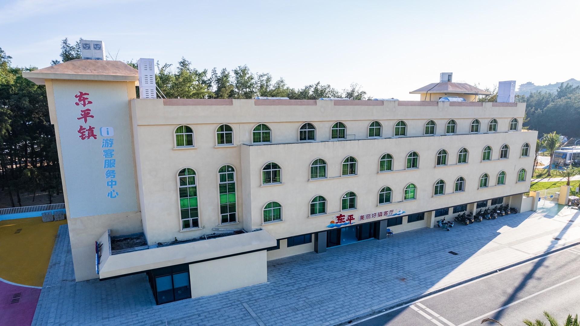 东平镇美丽圩镇客厅坐落于珍珠湾景区旁,融合了圩镇客厅与游客服务中心的双重功能。客厅占地面积约1250平方米,其中客厅建筑面积610平方米,休闲广场面积640平方米。设计巧妙活化旧建筑,将海风与阳光融入其中,透过窗户即可眺望珍珠湾的无垠海景与绵长沙滩。室内展示内容丰富生动:党建成果、历史沿革、荣誉奖项、规划成效等板块,清晰呈现东平镇的发展脉络与崭新面貌;动态电子屏、绿能成果、特色文化展示及旅游指引,则为游客提供全方位介绍与便利。客厅还设有志愿服务岗,工作人员随时为游客提供咨询、引导与应急帮助,让旅途更贴心、更温暖。
