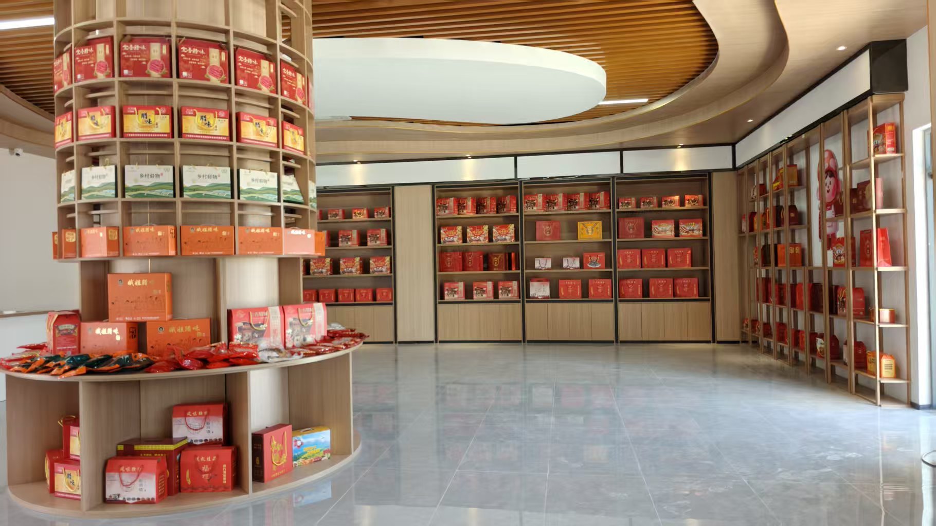 客厅一楼设有手礼展销中心,由金锋公司负责运营,集中展销新洲腊味、黄酒、红方糖等农特产品。同时,客厅内还配套建设了标准化电商直播间,常态化邀请本土网络红人现场直播带货,通过“线上引流+线下体验”的融合营销模式,拓宽产销渠道,赋能乡村产业发展,切实带动农户增收致富。