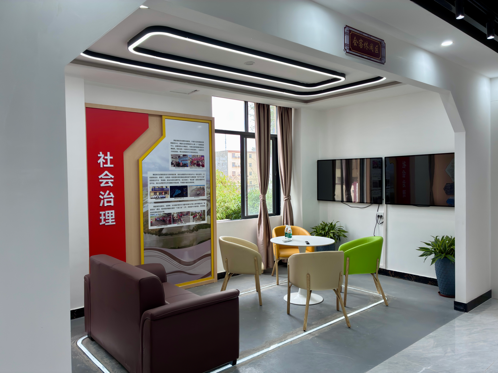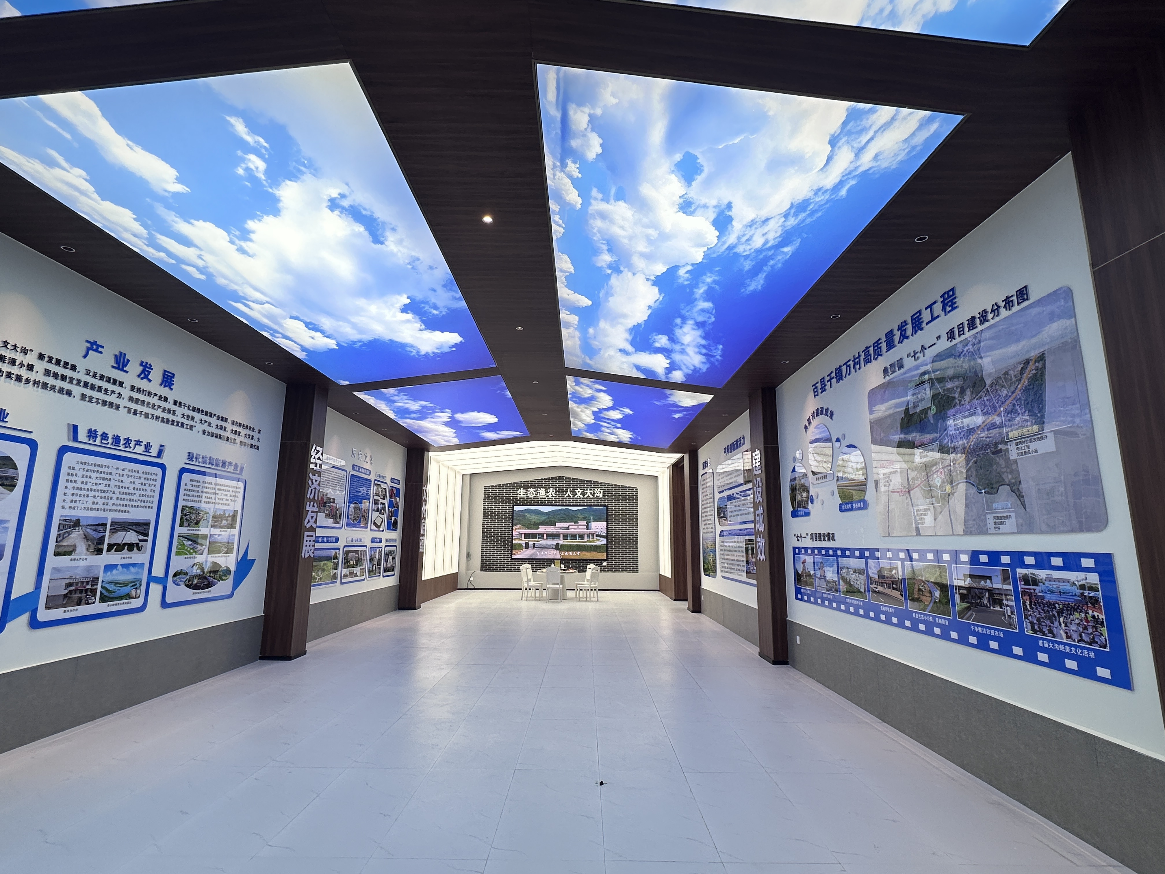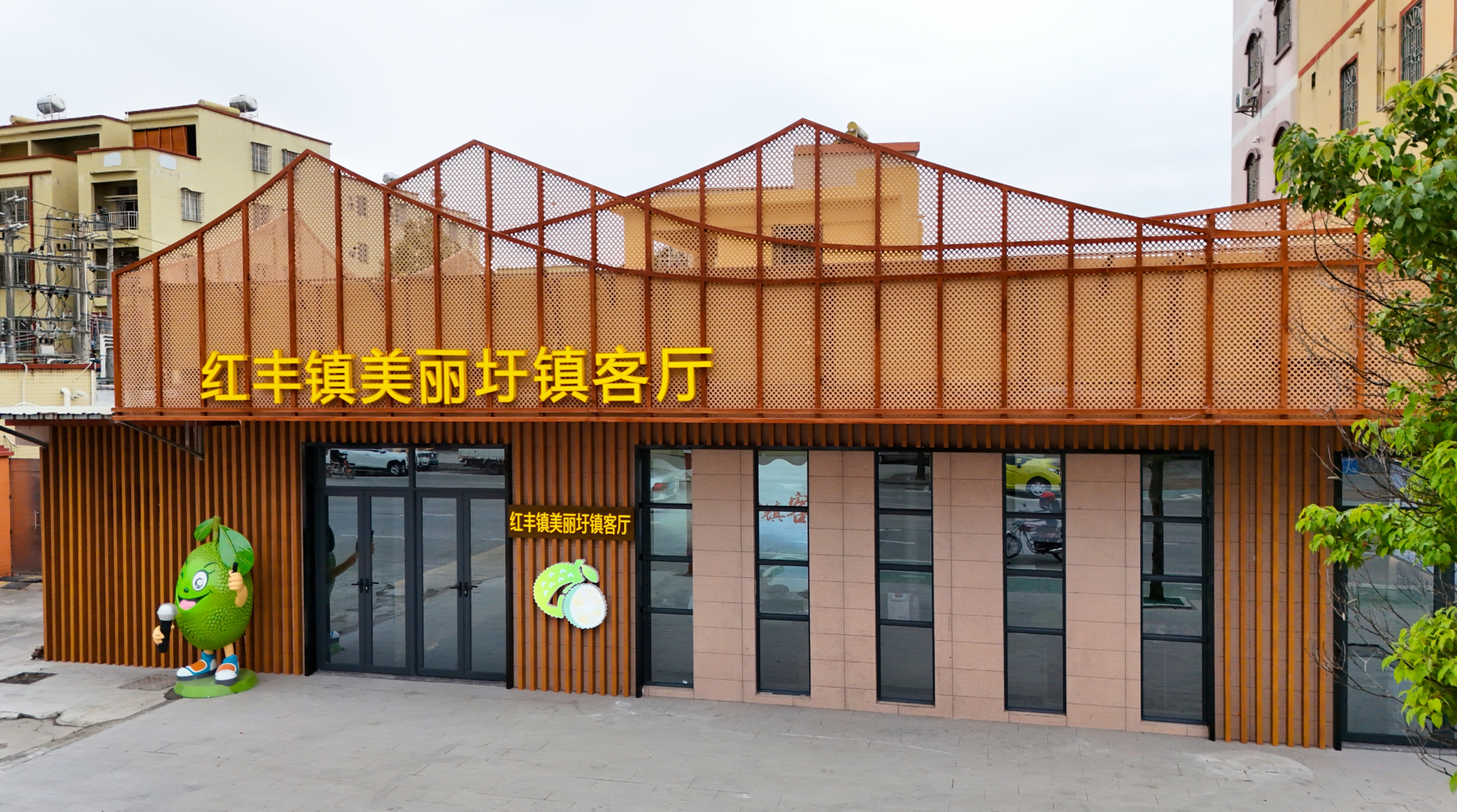 红丰镇美丽圩镇客厅由原退役军人服务站升级改造而成,总建筑面积560平方米。客厅巧妙融合展示、服务与休闲功能,打造出一张集“形象名片”与“民生驿站”于一体的城镇新名片。客厅入口处以本土菠萝蜜形象打造的IP标识,鲜明体现了地方特色。前厅是以智能化技术为核心的多功能展厅,通过高清视频、交互影像、图文展板和实物陈列等多种形式,生动呈现红丰镇的历史文化、产业优势、发展成就与未来蓝图,构成一个立体化的宣传窗口;后院则营造出轻松惬意的休憩空间,休闲会客区与咖啡屋相邻而设,为居民和来访者提供了一个交流互动、放松身心的温馨场所。这里不仅是了解红丰的窗口,更是融合公共文化、休闲体验与社区服务的新型复合空间。