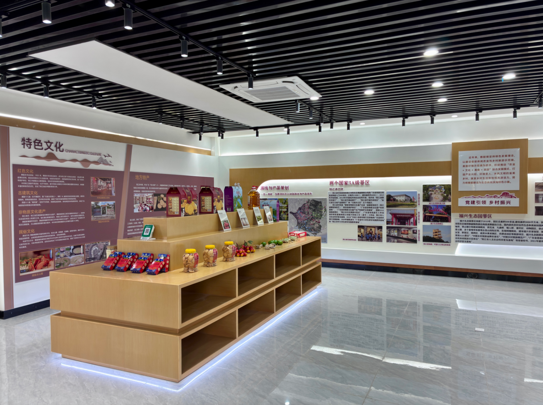 改造后,客厅集中呈现亨垌香蕉、温泉红茶、佛仔饼等本土特产及手轮脚轮等轻工产品,电子屏与实物展陈生动勾勒小镇发展脉络。外部配套广场、健身区、口袋公园及红茶体验馆,打造居民休闲和旅客驻足的惬意空间。