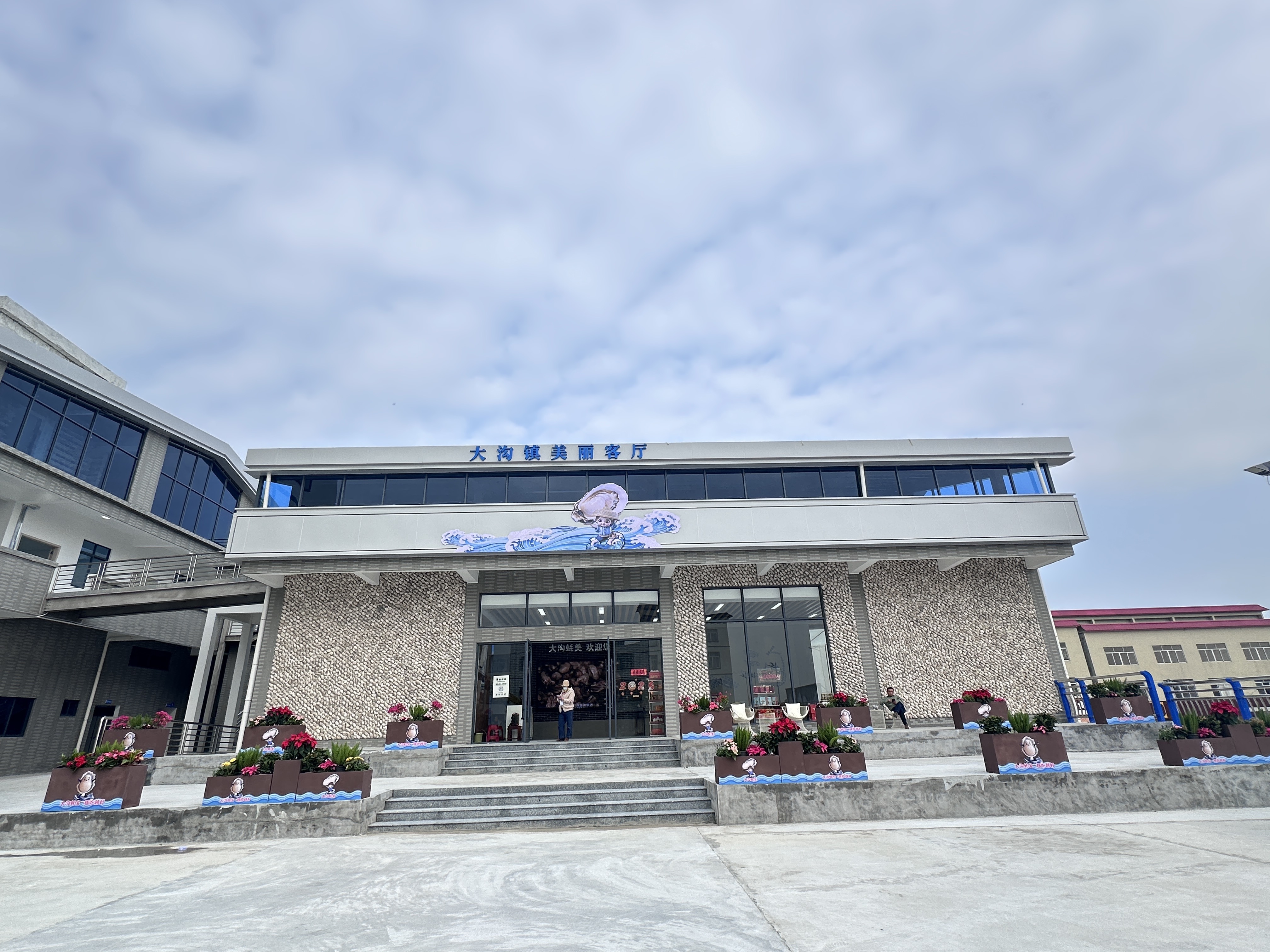 大沟镇美丽圩镇客厅位于镇中心核心地段,占地2000平方米,建筑面积1200平方米,建筑整体融合了大沟镇传统渔家元素与现代简约风格,兼具实用性与设计感。客厅一楼主要为农产品展销区,空间宽敞,布局规整,这里汇聚了全国名特优新农产品寿长蚝,还有大沟锦栗薯、玉米等特色农作物,以及各类海鲜干货、水果制品等。展销区配备完善的冷藏、保鲜设备,保障农产品新鲜度与品质 ;沿客厅周边与内部通道两侧规划了多种面积的商铺,从特色手工艺品店、民俗文化纪念品店,到渔具、渔服售卖店等,可满足不同商家需求;客厅还配有直播带货区以及二楼轻餐饮区。餐饮区采用落地玻璃窗设计,通透明亮,就餐时可享受开阔的镇内风景。