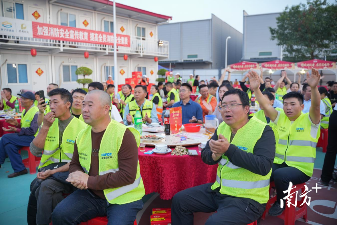 傍晚时分,东莞沙田镇狮子洋通道工地亮起灯光。作为粤港澳大湾区核心枢纽工程,往日以钢筋水泥和机器轰鸣为主角的施工现场,这一晚多了歌声、笑声和烟火气。留莞坚守的一线建设者围坐在一起,提前吃上一顿热乎的团年饭。