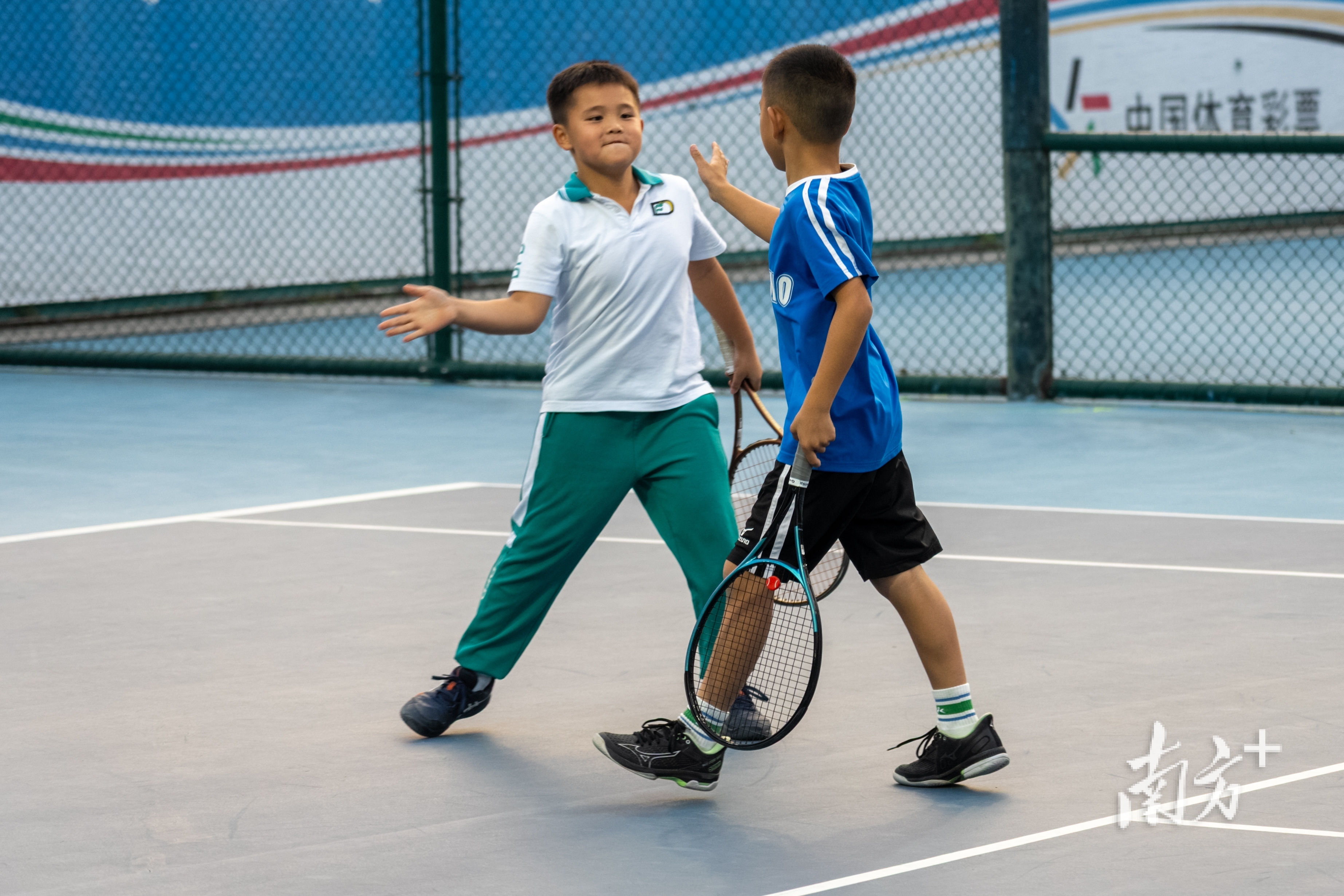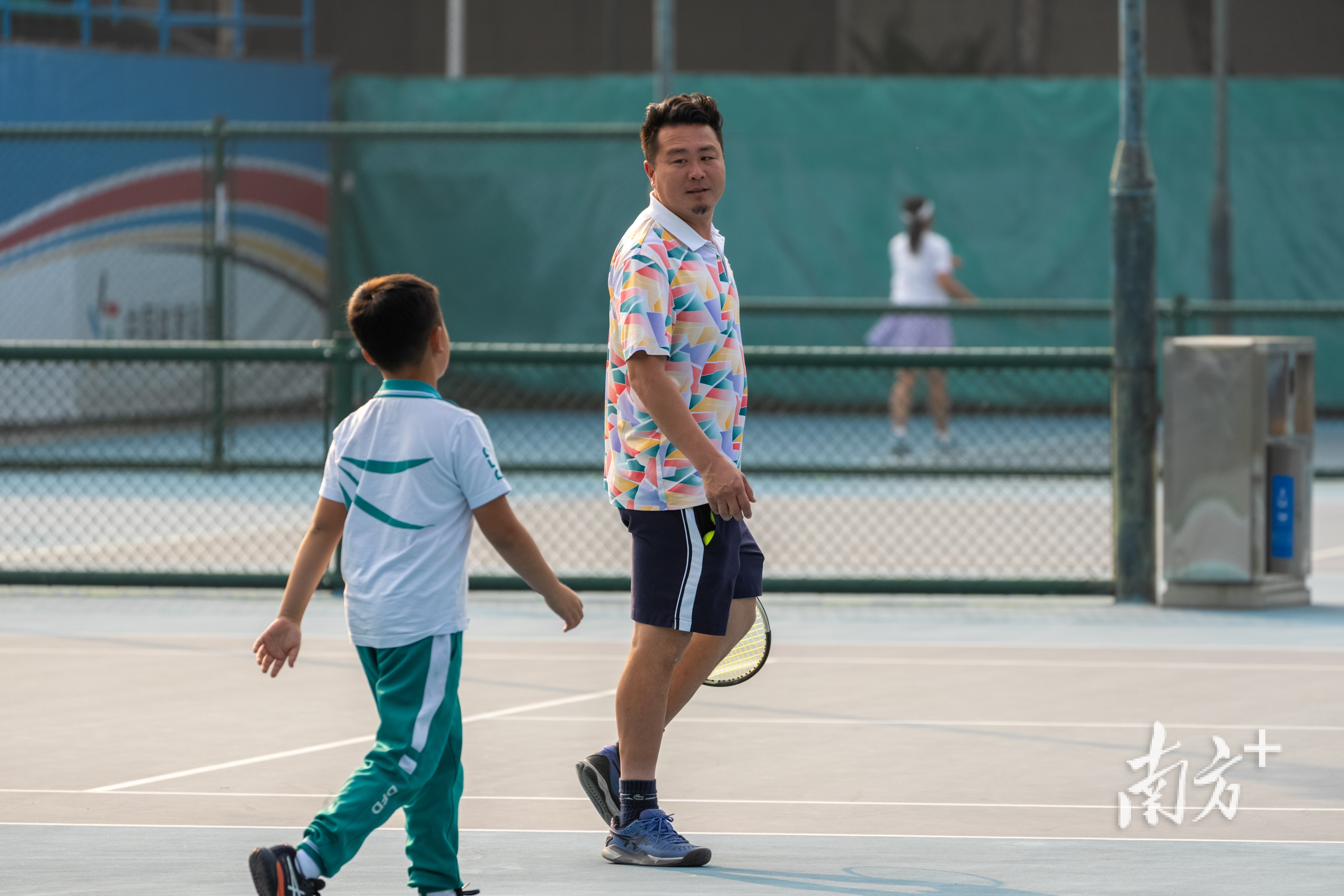 李中新背着沉甸甸的球包走进场地,绿白相间的校服还未褪去,衣角带着些许校园的烟火气。见到教练姜洋,他立刻上前,小脸上写满学生特有的认真:“教练,我们今天练什么。”姜洋不仅是他的教练,也曾是这里走出的优秀球员——广州市网球队原队员,入选过国家队集训,战绩赫赫,并在转型教练后,为队伍培养了众多人才。