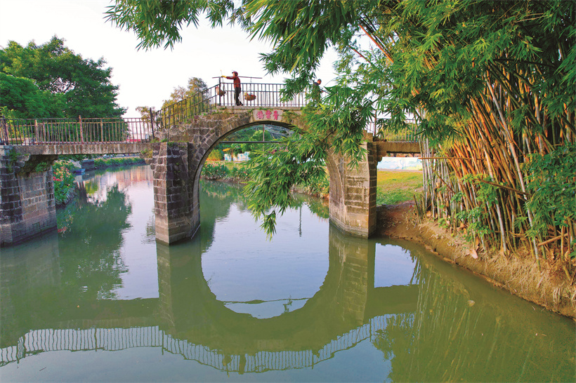 沿着桥头新修的生态步道漫步,可见崭新气派的水泵站、与古村风貌融为一体的现代化垃圾分类站、设备齐全的停车场……就连那些曾经破败的老桥老屋,在“微改造”中也焕发着新生,真可谓一步一景、步步惊喜。而青云桥本身也通过结构加固、石材修补与栏杆更新,在保持清代三孔石桥原有形状的同时提升了安全性与观赏性。桥身依旧是当年厚实的青石砌筑,拱洞倒映水中形成圆影,与岸边蓊蓊郁郁的竹林、新栽的红花绿草相映成趣。村里已完成历史使命的“协合成”碾米厂,斑驳的墙身穿上了鹅黄色新衣,腐朽梁柱采用传统工艺加固,前后配备各类轻巧的现代化设施。这种“修旧如旧”的巧思,让村民在享受现代便利的同时,延续了世代传承的乡居记忆,也让青云桥继续作为联结村落历史与当下的空间纽带。
