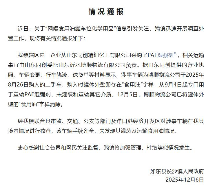 12月6日,江苏如东县长沙镇人民政府发布情况通报:近日,关于“网曝食用油罐车拉化学用品”信息引发关注,我镇迅速开展调查处置工作,现将有关情况通报如下:我镇辖区内一企业从山东同创精细化工有限公司采购了PAE湿强剂,相关运输事宜由山东同创委托山东沂水博顺物流有限公司负责。据山东同创提供的营业执照、车辆变更、行车轨迹、送货单等材料显示,涉事车辆为博顺物流公司于2025年8月26日购入的二手车,购入时罐体外壁即存在“食用油”字样,从9月4日起专门用于运输PAE湿强剂,未灌装和运输其他介质。12月5日,博顺物流公司已将罐体外壁的“食用油”字样清除。