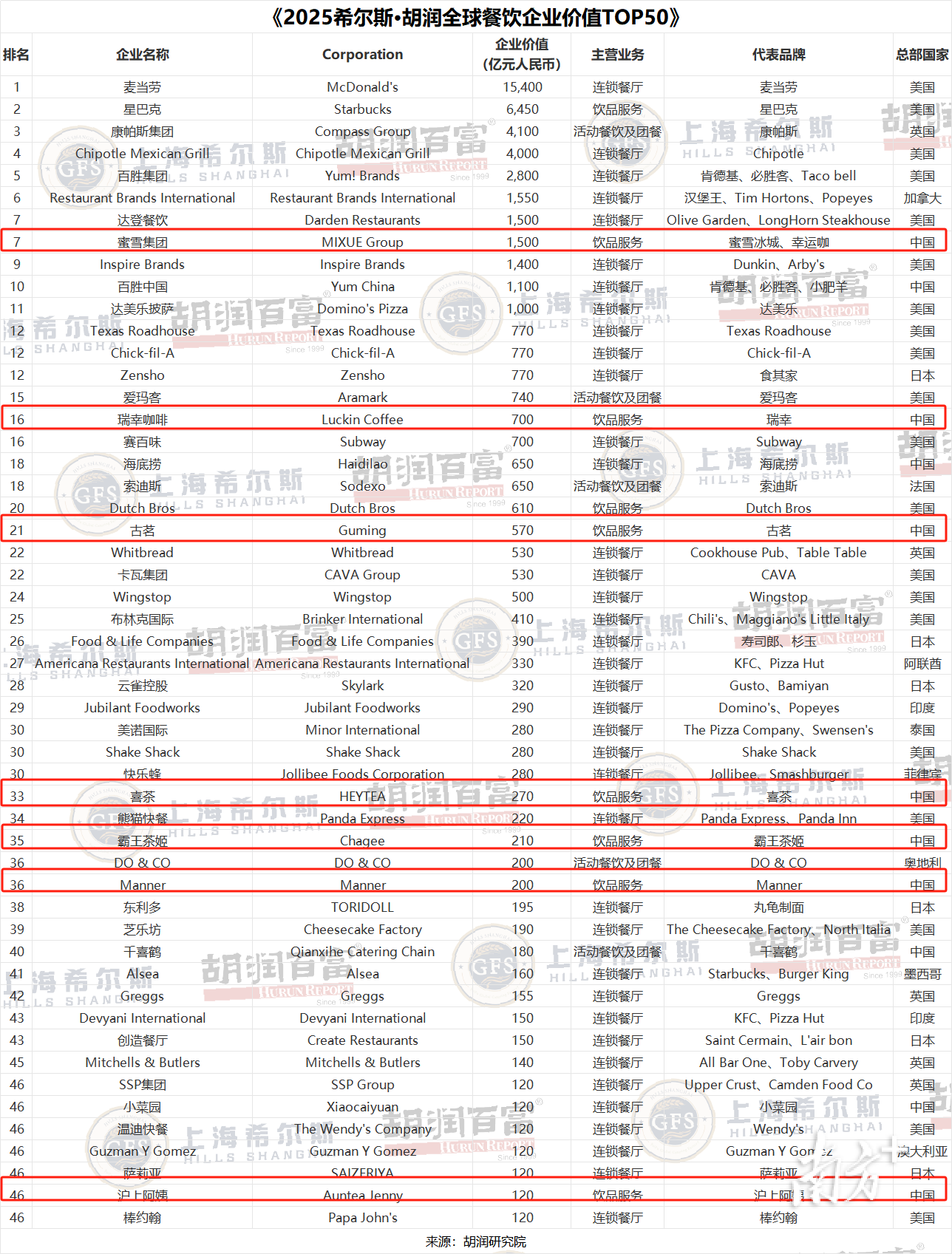 值得关注的是,在今年5月发布的《2025胡润中国新茶饮品牌TOP20》中,蜜雪冰城、古茗、霸王茶姬、喜茶、沪上阿姨位列前五,与本次榜单高度呼应。这反映出,在中国市场确立领先优势的头部品牌,正持续将其影响力拓展至全球舞台。