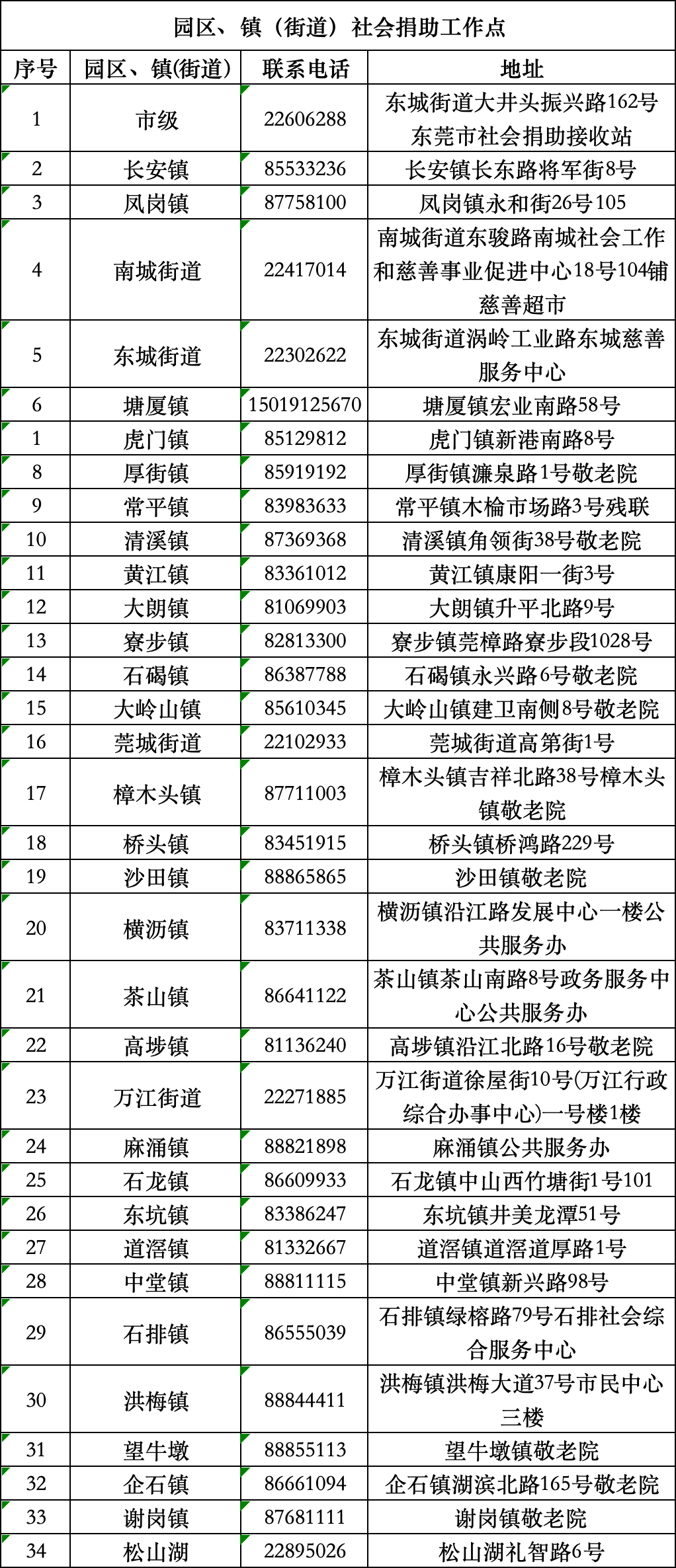 或许,您来自爱心企业、公益慈善组织、社会组织,欢迎捐赠取暖物资、生活物资、慰问金,提供爱心帮扶服务,可以联系社会捐助工作点捐赠物资,也可以直接到东莞市慈善会现场捐款(地址:东莞市莞城街道万寿路76号),联系电话:0769-22225922,0769-22222628,0769-22227699。您的一片善心,都可能让需要的人看到希望。