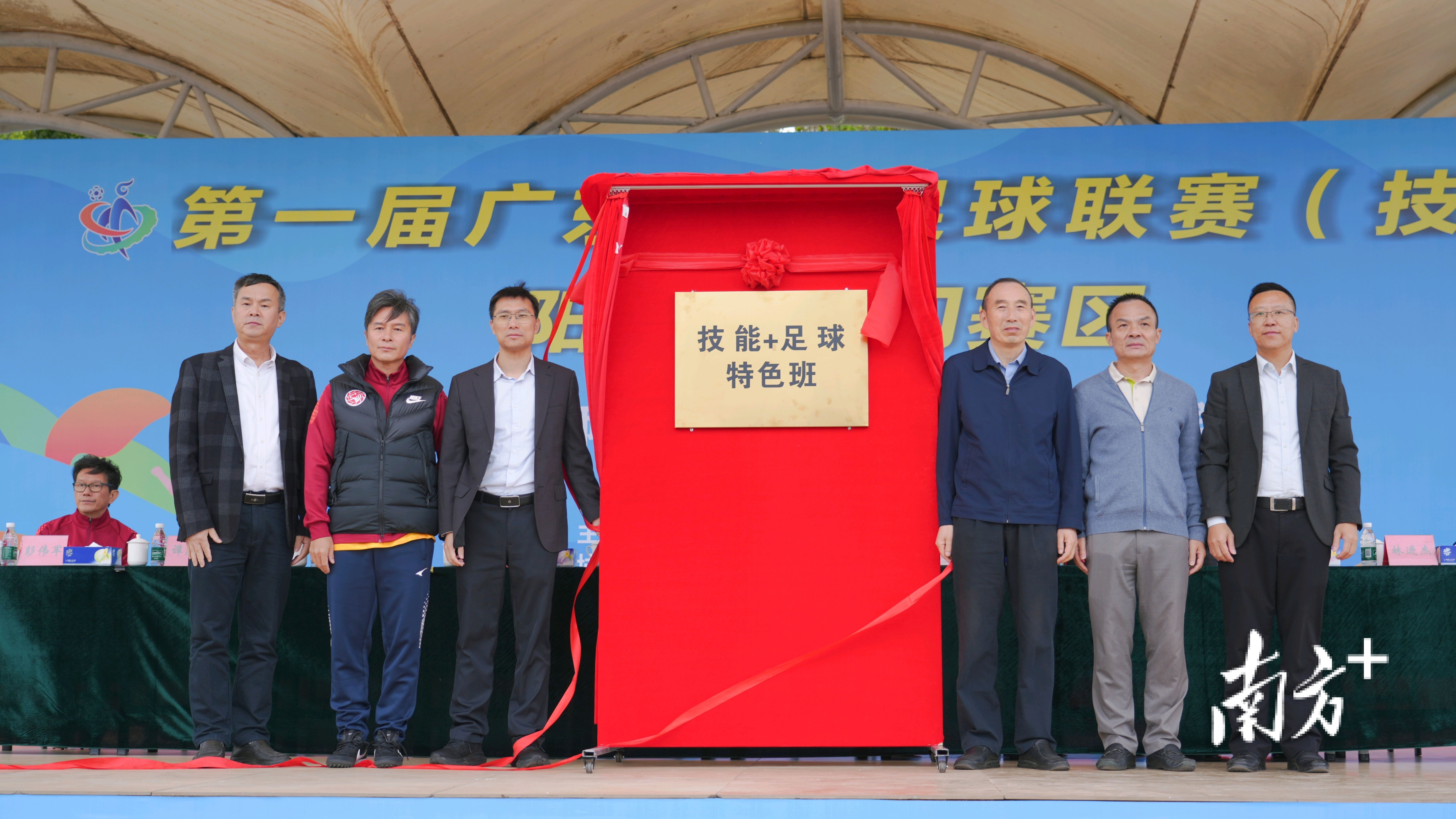 本次活动的核心亮点之一,是“足球+技能特色班”的正式揭牌。活动现场,广东省职业培训和技工教育协会常务副会长范奎银、阳江市人社局副局长曾庆光、足球名宿彭伟国等嘉宾共同移步台前为特色班揭牌,随着红布落下,标志着阳江技工教育领域探索“足球教育与技能培养深度融合”的创新举措正式落地。