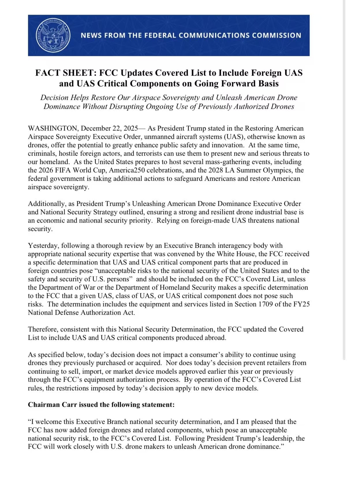 根据要求,被列入覆盖清单的新设备(如外国制造的无人机)将被禁止获得 FCC 授权,因此不得进口到美国使用或销售。本次覆盖清单更新不禁止FCC 此前已授权的现有设备型号的进口、销售或使用。本次行动不影响任何已购买的无人机。消费者可继续使用其已合法购买或获取的无人机。