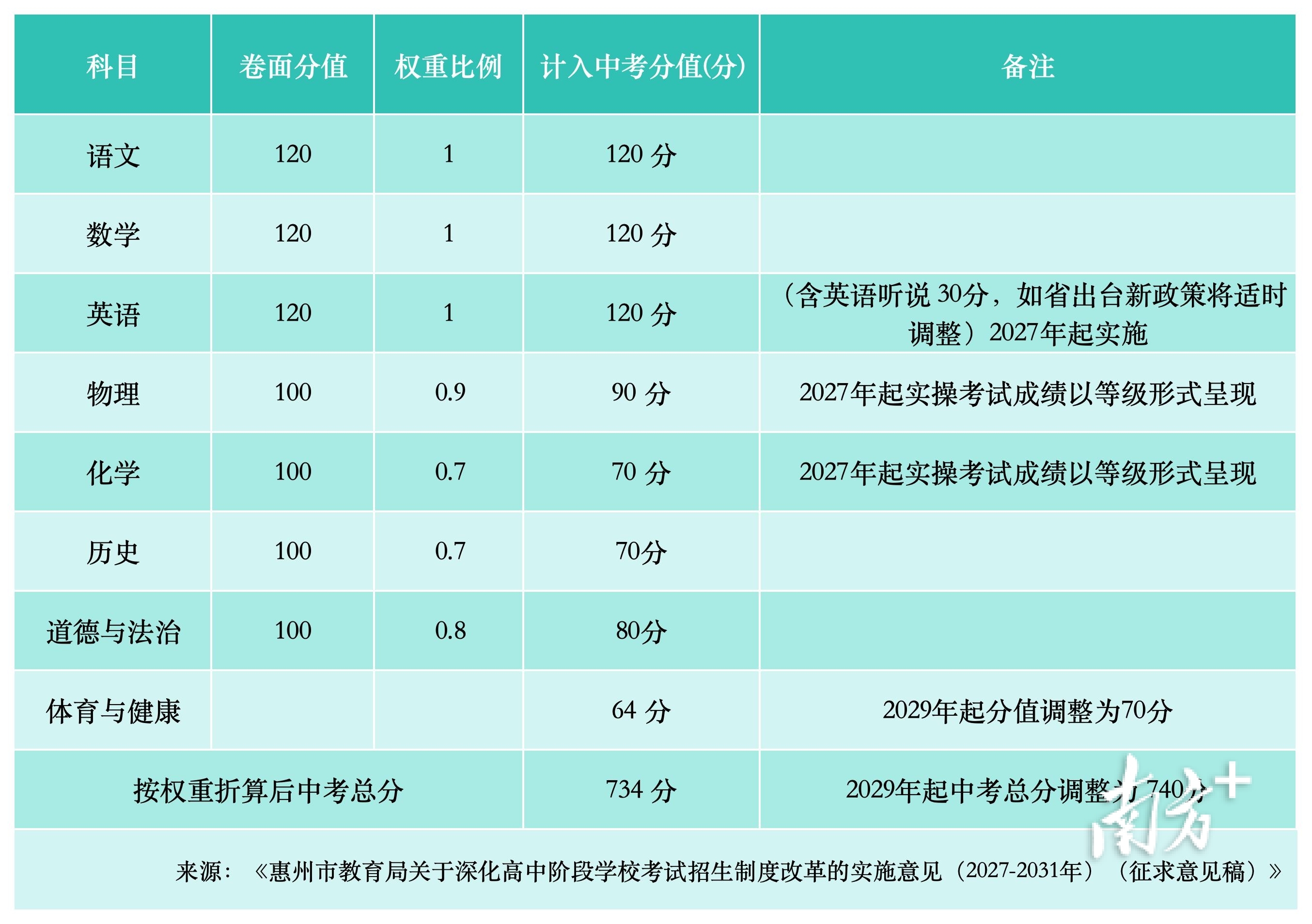 英语分值权重调整。为进一步衔接高考英语,2027年起,英语科目权重比例拟不折算,分值为120分。依据2024年出台的《惠州市初中学业水平考试英语听说考试工作方案(试行)》,2027年起,英语听说考试成绩正式计入惠州中考录取总分,取消省教育考试院统一命题英语科目中的听力部分,听说考试分值与省命题听力部分保持一致。