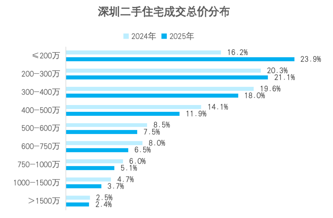 区域成交呈现“八增二降”态势:光明、大鹏、坪山成为增长前三,同比增幅分别为54%、27.5%、17.7%;福田、南山则同比下降7.0%、2.0%。总价分布上,刚需属性凸显,300万以下房源成交占比达45%,其中200万以下占比23.87%,200-300万占比21.10%。同时,各区议价率全线上升,全市平均议价率达8.18%,业主调价意愿增强。