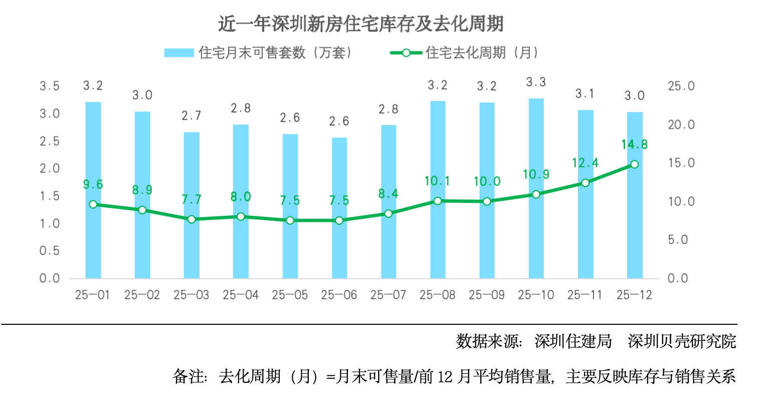 整体来看,2025年深圳新房住宅供应收缩且去化放缓,市场去化效率有所降低。12月底新房住宅库存缩至3.0万套,反映库存消化速度的去化周期从1月的9.6个月升至12月的14.8个月,尤其下半年8月后涨幅明显,或与销售节奏放缓相关。
