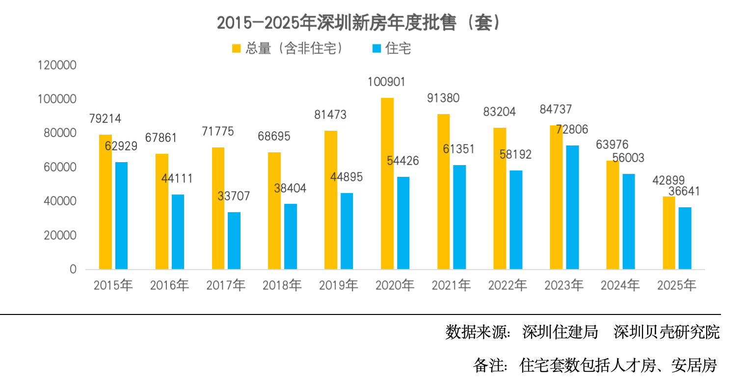 新房物业类型包含住宅、办公、商业、商务公寓及“其他类型”。报告数据显示,2025年深圳住宅供应量为36641套,同比下降34.6%;新房总量(含非住宅)供应42899套,较2024年的63976套大幅减少33.1%。