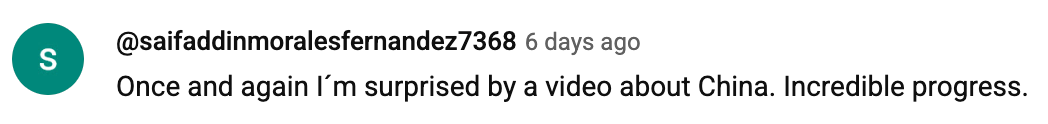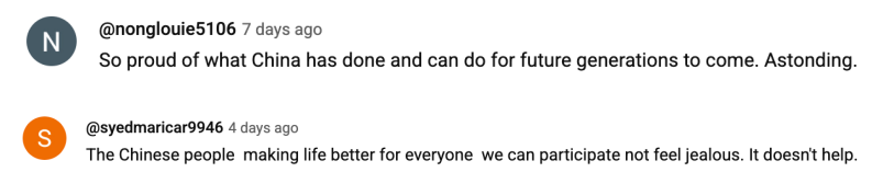 也有观众留言表示:“为中国正在做、并将持续为下一代所做的一切感到骄傲,这样的发展令人震撼。”有网友进一步指出,中国的发展实践致力于改善民生、促进社会进步,值得更多国家理性看待和借鉴。
