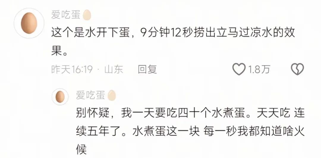 2025年12月,一位名为“爱吃蛋”的普通网友在抖音评论区留下两条“精准到秒”的留言:“煮鸡蛋必须9分钟12秒”“一天要吃40个水煮蛋”。