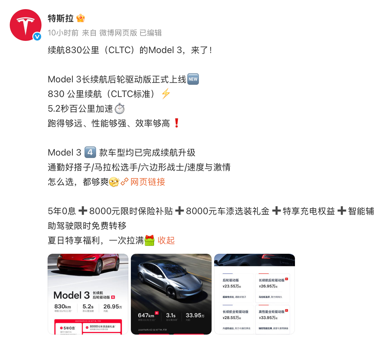 8月12日,特斯拉宣布推出全新Model 3长续航后轮驱动版(以下简称“长续航后驱版”),新车续航得到大幅加强,达到830km,是目前所有版本之最,零百加速为5.2秒,区别于后轮驱动版的6.1秒,官方起售价为26.95万元,目前可享5年0息和8000元显示保险补贴。
