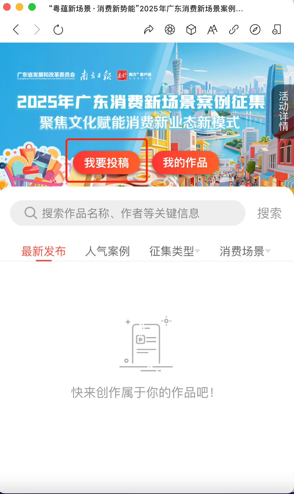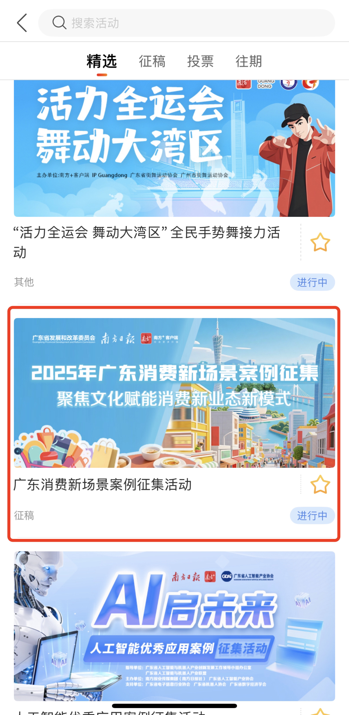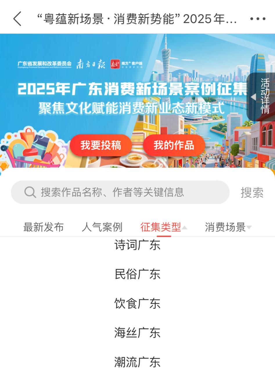 下载并进入南方+客户端,点击右下角【我】—【精选活动】—【查看更多】—【2025年广东消费新场景案例征集】—点击【我要投稿】—选择【征集类型】—选择【征集场景】
