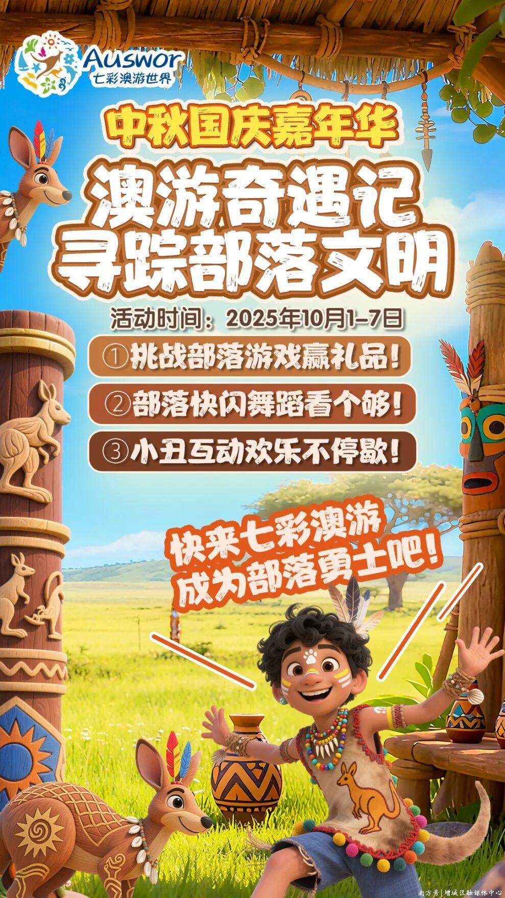 活动预告:以七彩澳游世界中沉睡的七个部落故事为背景,首个部落将在国庆期间隆重开放。园区将针对家庭、情侣、学生等多种游客群体,在园区内举办有趣的原始部落体验活动。该活动包括丰富的游戏装置、定时的精彩舞蹈表演、近距离互动环节等,让游客在园区内沉浸式体验异域部落文化和浓烈的部落氛围。