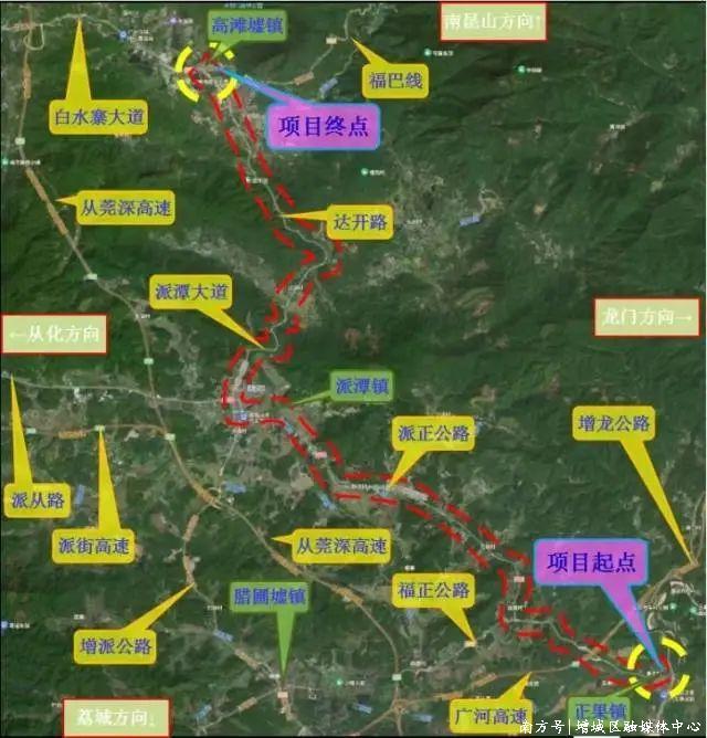 增城最美旅游公路示范段全长约28公里,位于增城区正果镇、派潭镇境内,由国道G355派正路(正果大桥-派潭墟派从路口)、县道X292派高路(派潭墟派从路口至白水寨大道口)两段组成,结合原有公路基础设施串联区域公路、旅游集散中心、主要景点。