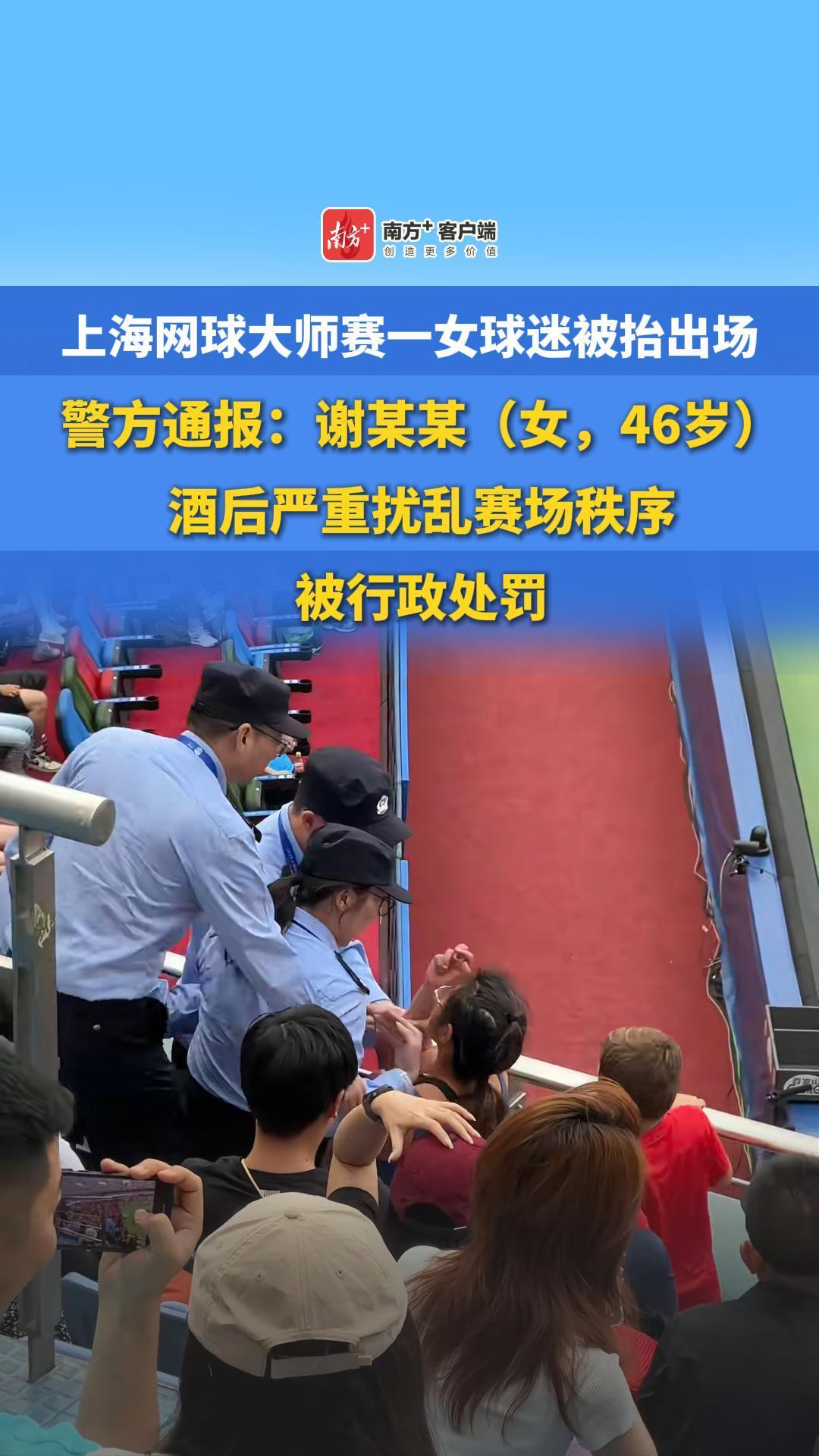 上海网球大师赛一女球迷被抬出场 警方通报:谢某某(女,46岁) 酒后严重扰乱赛场秩序 被行政处罚