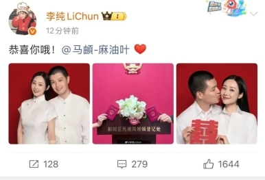10月2日中午12时,著名女演员李纯与著名男歌手马頔同时在社交账号官宣结婚,并@ 对方,互赠一句:“恭喜你哦!”37岁的李纯是北京电影学院科班出身,2011年正式入行,4年后因在古装仙侠剧《花千骨》中饰演霓漫天而为观众熟知,她也凭借该剧入围国剧盛典最佳女配角。详情>>