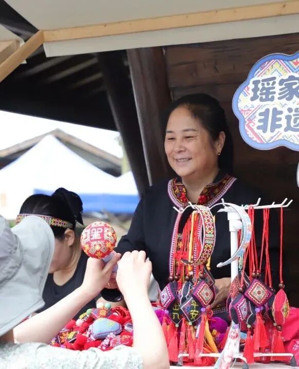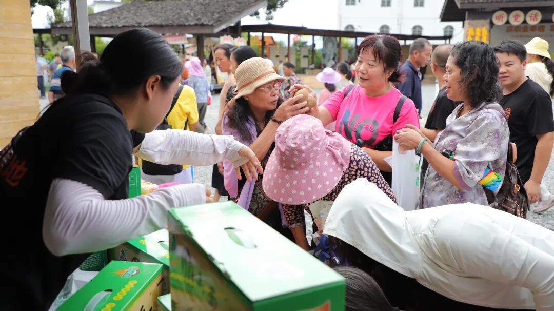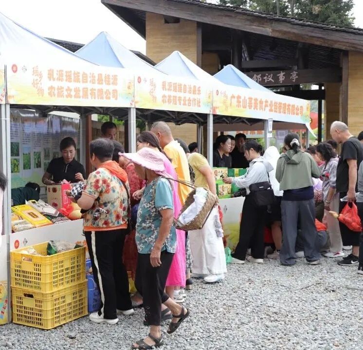 在自由参观和体验环节,主会场周围设置了丰富的农产品展销市集和非遗文创展区,琳琅满目的名特优新农产品、精美的瑶绣等非遗产品吸引了不少游客驻足欣赏和选购。现场还开展了丰收券发放的促消费活动,优惠多多,惊喜连连,为乳源的优质产品打Call。
