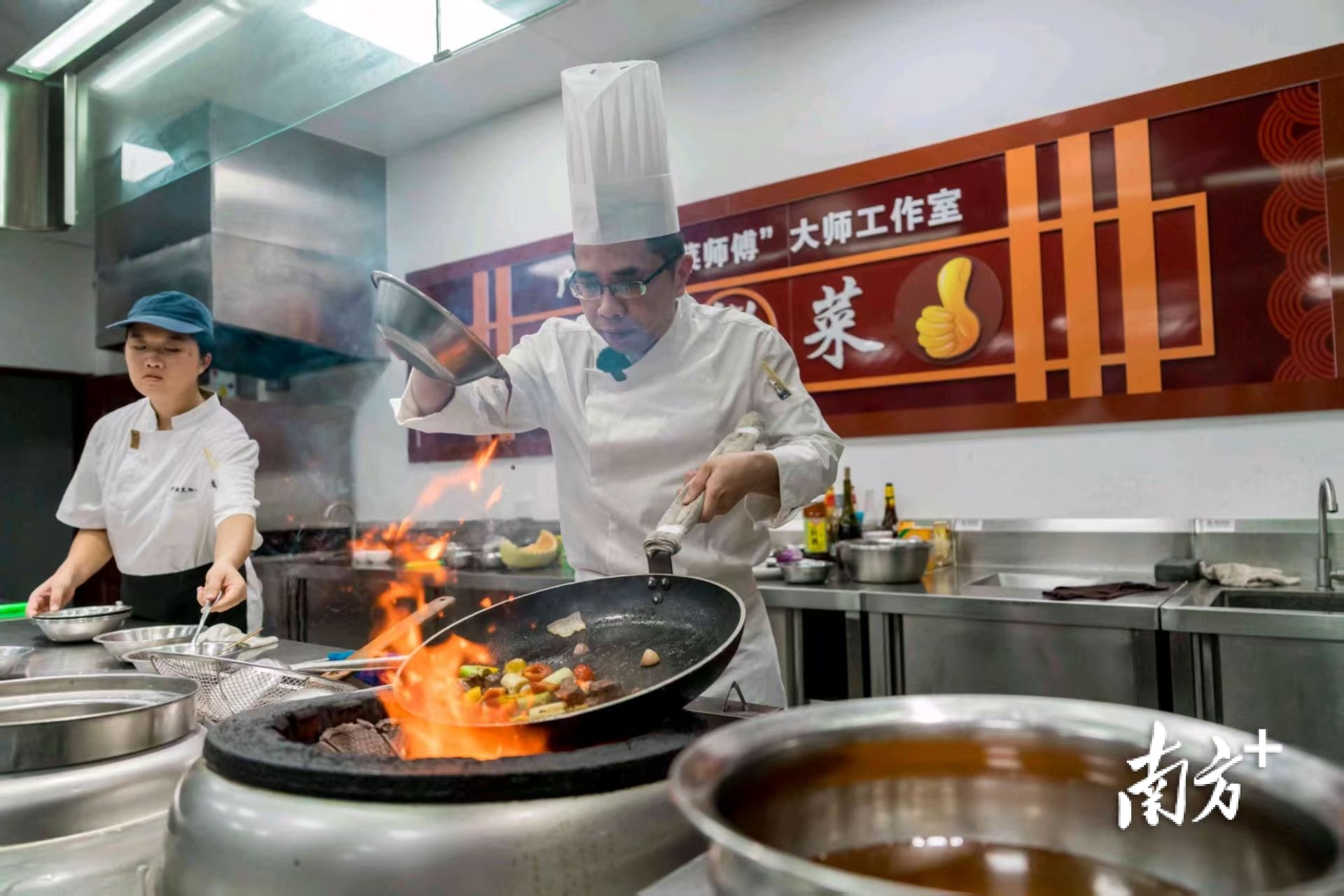 茂名市高凉菜大师叶易泉在烹饪荔枝宴。