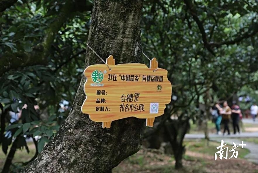 高州根子贡园的古荔树下,一块块标注着企业名称或个人姓名的定制铭牌随风轻摆,标示“名荔有主”。