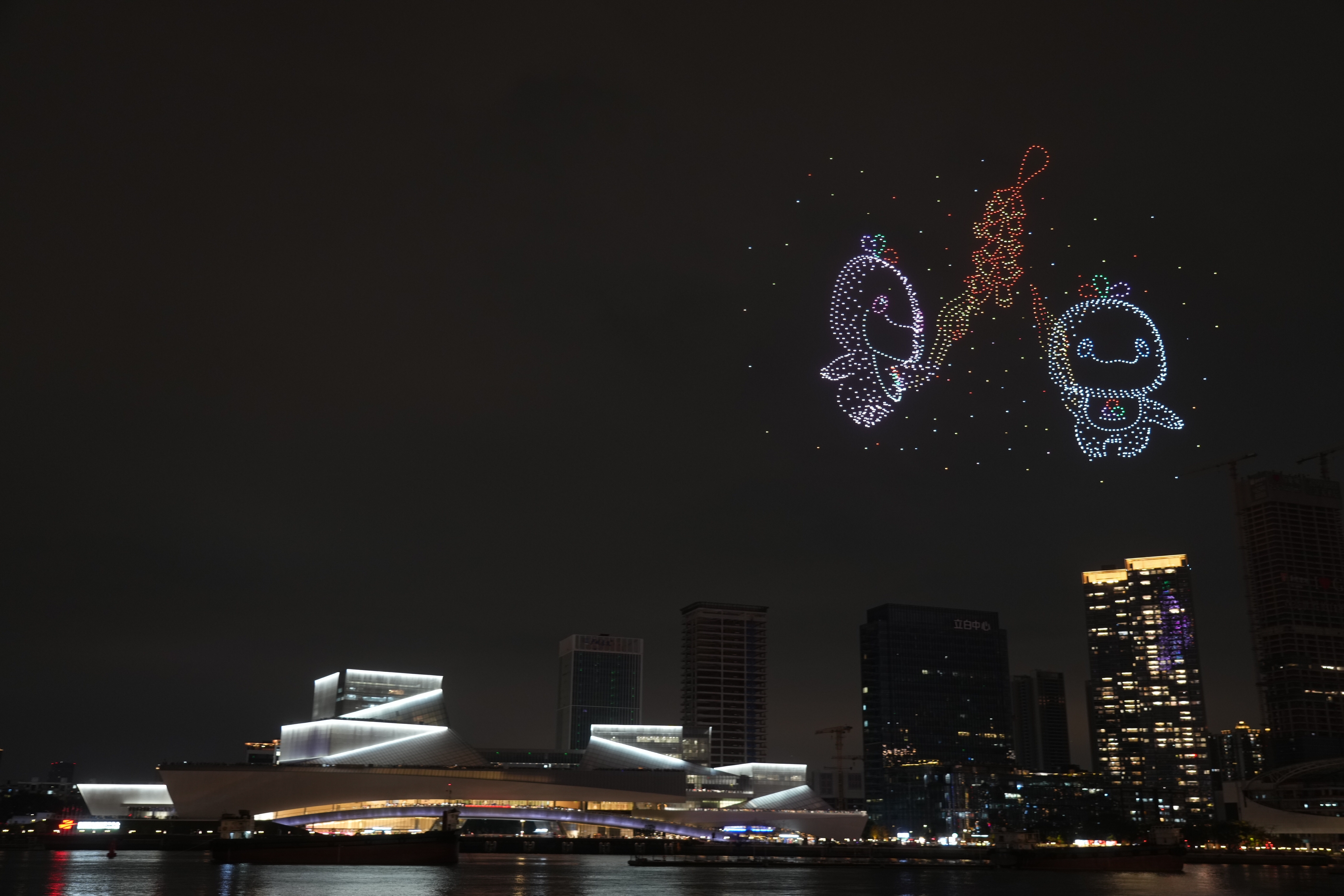 夜幕初垂,白鹅潭水域化身巨大的沉浸式舞台。两岸现代楼宇立面流光飞舞,与江面粼粼波光共同织成一幅动态美景。晚8时整,随着活动启幕,早已静静悬浮于夜空中的2026架无人机,宛若一幅深邃的星图被瞬间点亮,正式拉开了汇演序幕。