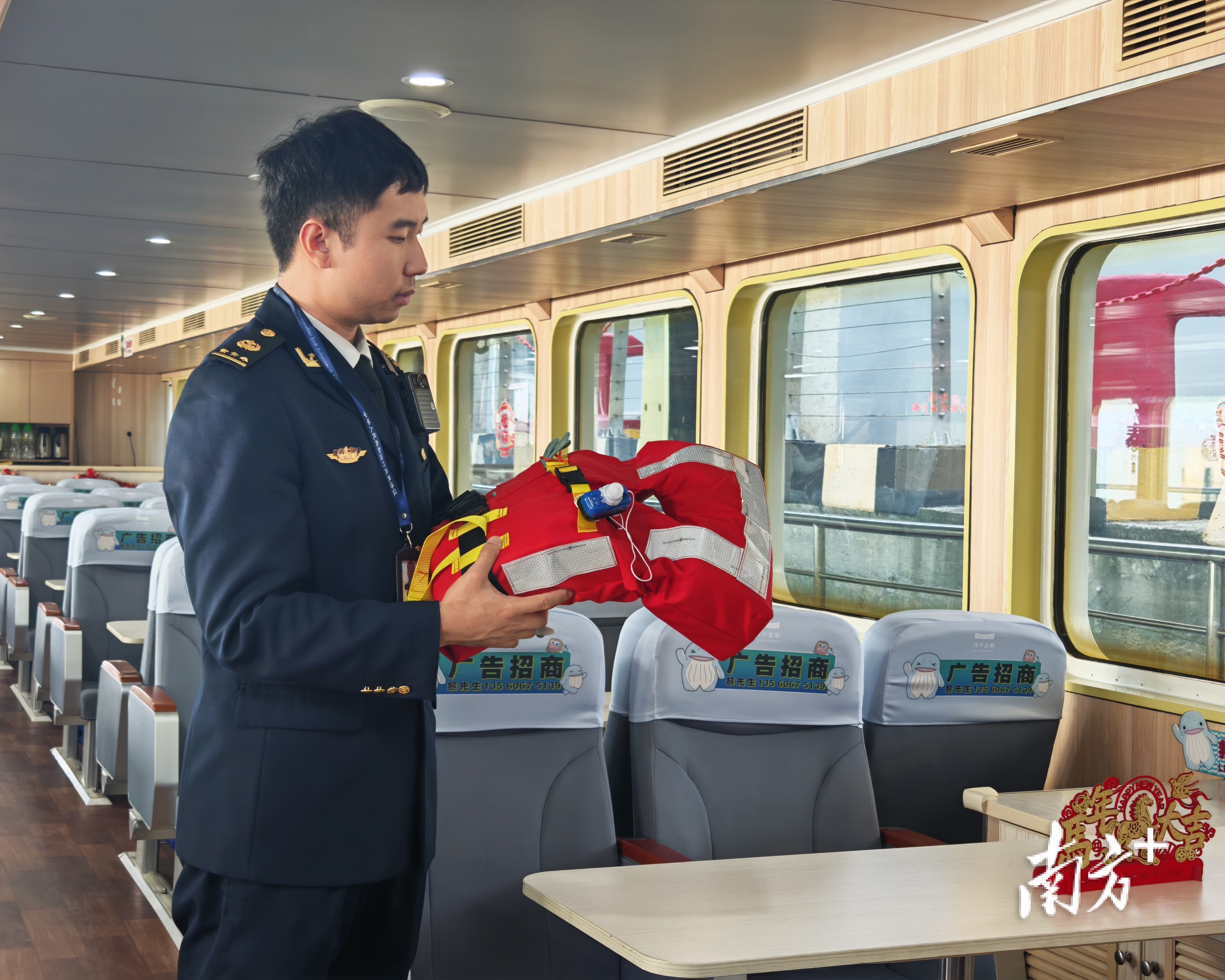 “海风大,带小孩的旅客请抓好扶手!救生衣都在座位下方,有问题请随时喊我。”2026年除夕,是中山首条深中通道观光航线开通的第三天,这天,中山海事局执法人员黄映翔的声音在深中通道观光航线的登船点回响。