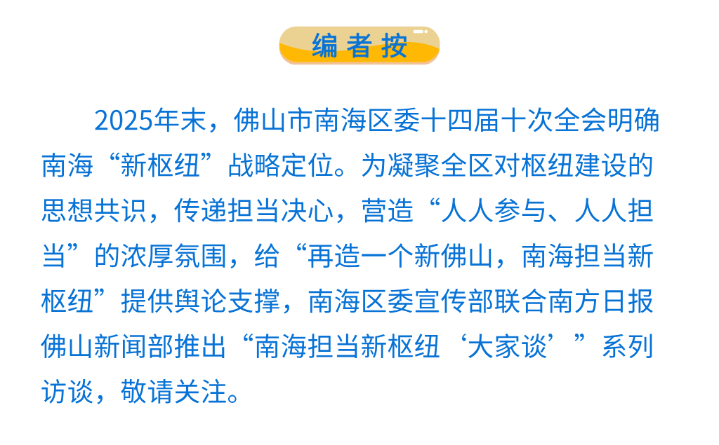 我们的目标很明确,就是要让每一位海内外南海人都能成为“新枢纽”建设的参与者、贡献者和受益者,共同把南海的区位优势、侨乡优势,转化为实实在在的发展胜势。