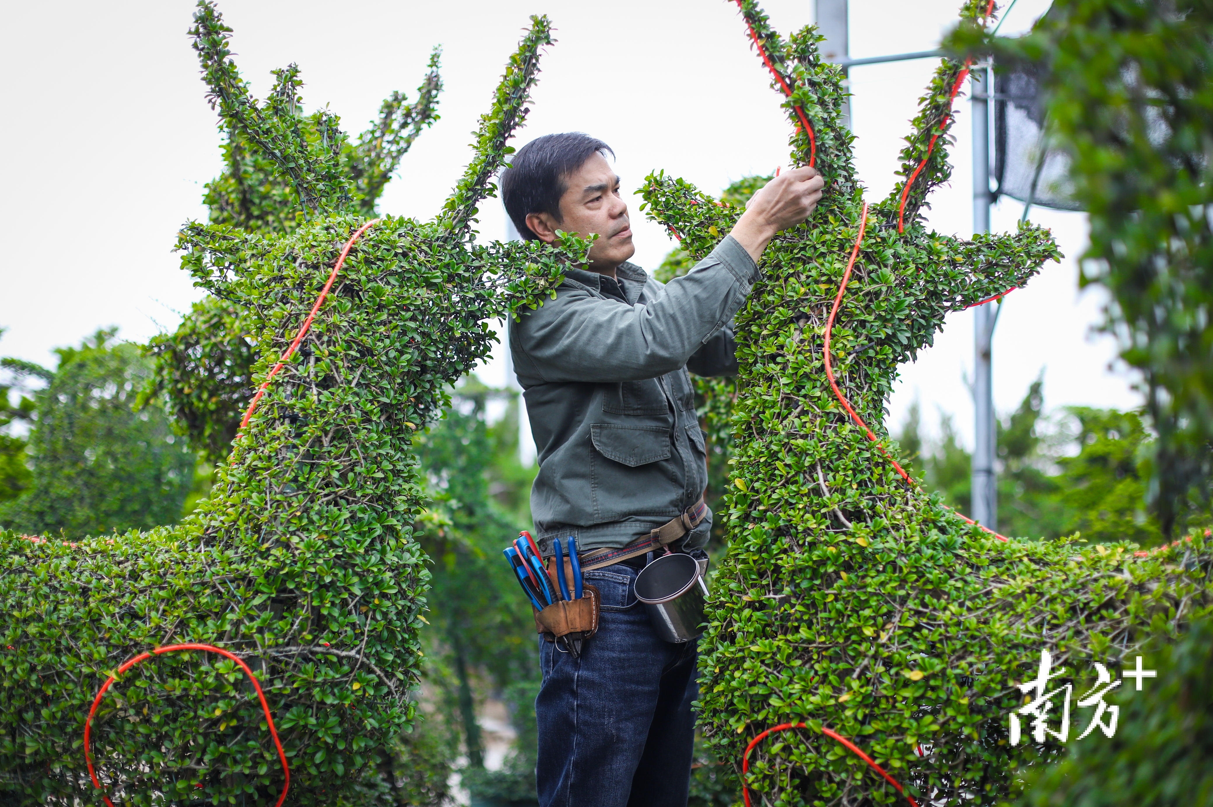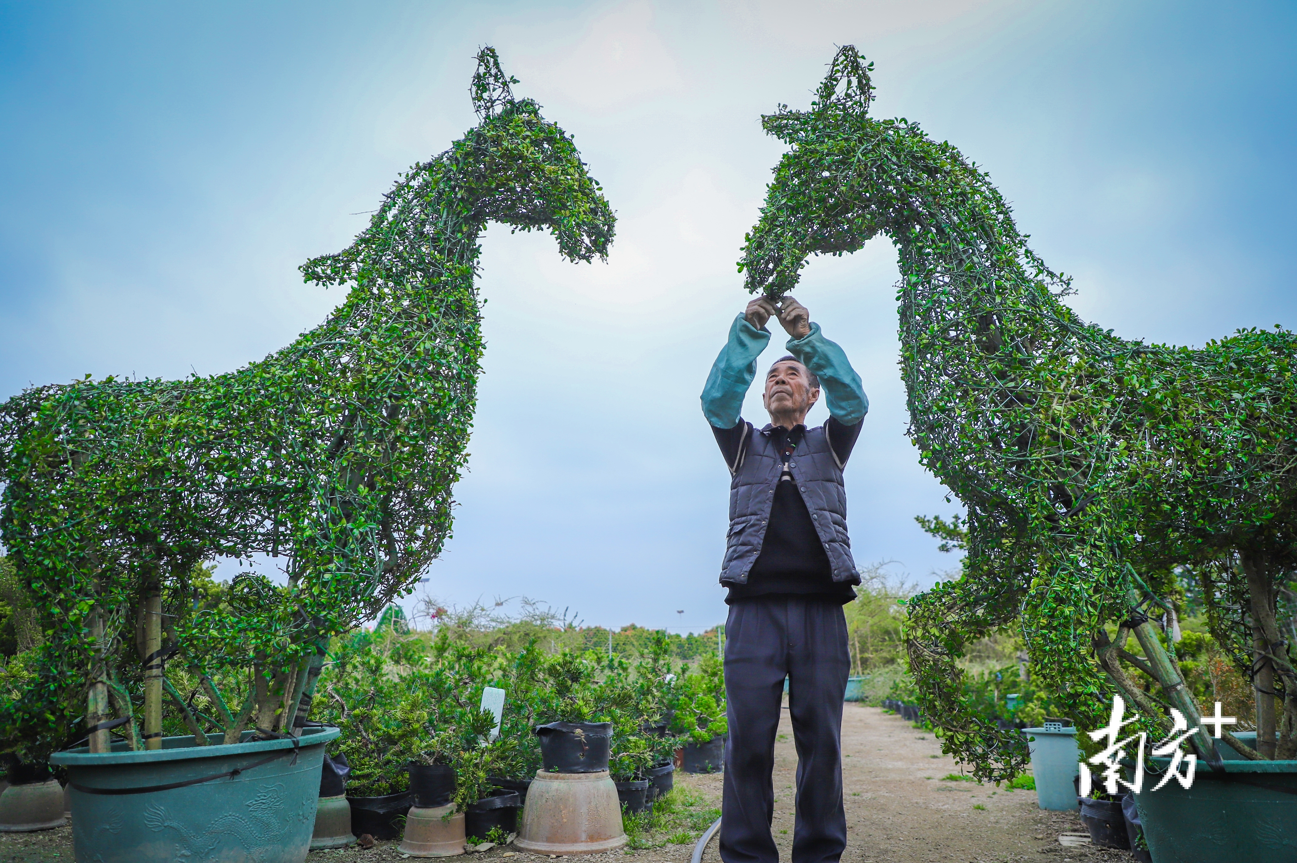 在翁厝村的六桂园,园艺师翁锡仲正全神贯注地修剪一匹近2米高的“绿雕马”。剪刀起落间,马的姿态逐渐清晰。“今年准备了十匹‘马’,正月正是销售旺季。”他说,做一匹要5天,从头部到身姿都得一点点塑形。在他身后,花园仿佛变身“动物园”:十二生肖、双龙戏珠、长颈鹿……栩栩如生。这些绿雕,是植物与艺术的融合,更是两代匠心的接力。儿子翁集强既传承了父亲的技艺,更以现代视野开拓市场,让这些作品走出金石,装点粤东、珠三角的庭院广场,乃至亮相上海世博会、远渡东南亚。