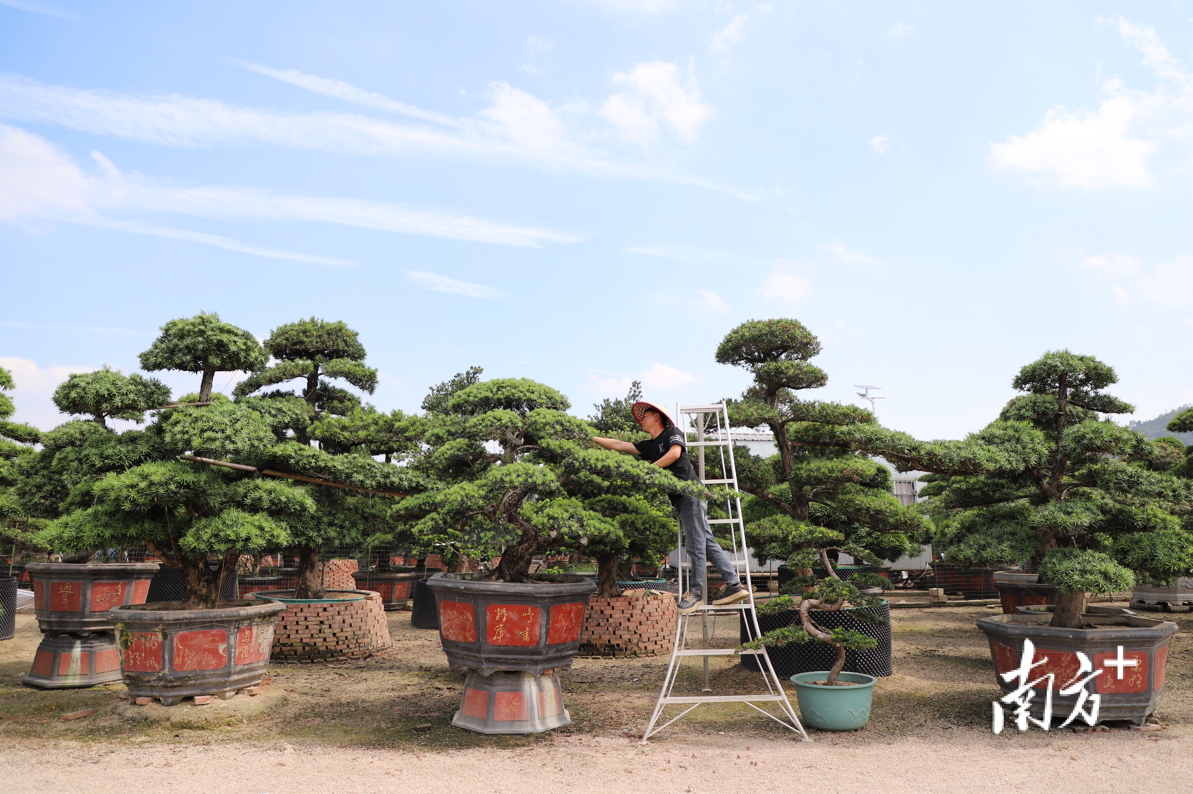 不远处,东莆花卉园区里,董思雁正在修剪一株两米高的S形罗汉松。“S形罗汉松是潮州特色,造型别致。”他的技艺源自祖辈传承,如今作品已远销全国高端景观市场甚至海外。