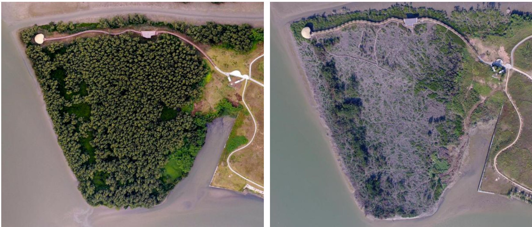福田红树林生态公园外来红树治理前(左)后(右)。图源:广东省湿地保护协会