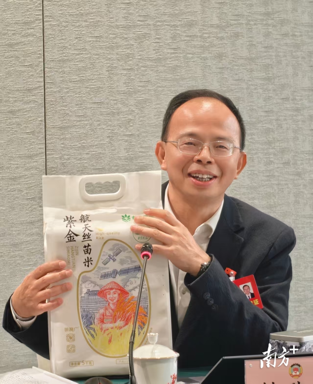 “这两样东西有着共同特质:华农技术、校地合作、广东原产、品质优良!”省政协委员、华南农业大学党委宣传部(党委统战部)部长钟耿涛一手举米,一手拿茶,笑着为自家产品“带货”,吸引了委员们的目光。
