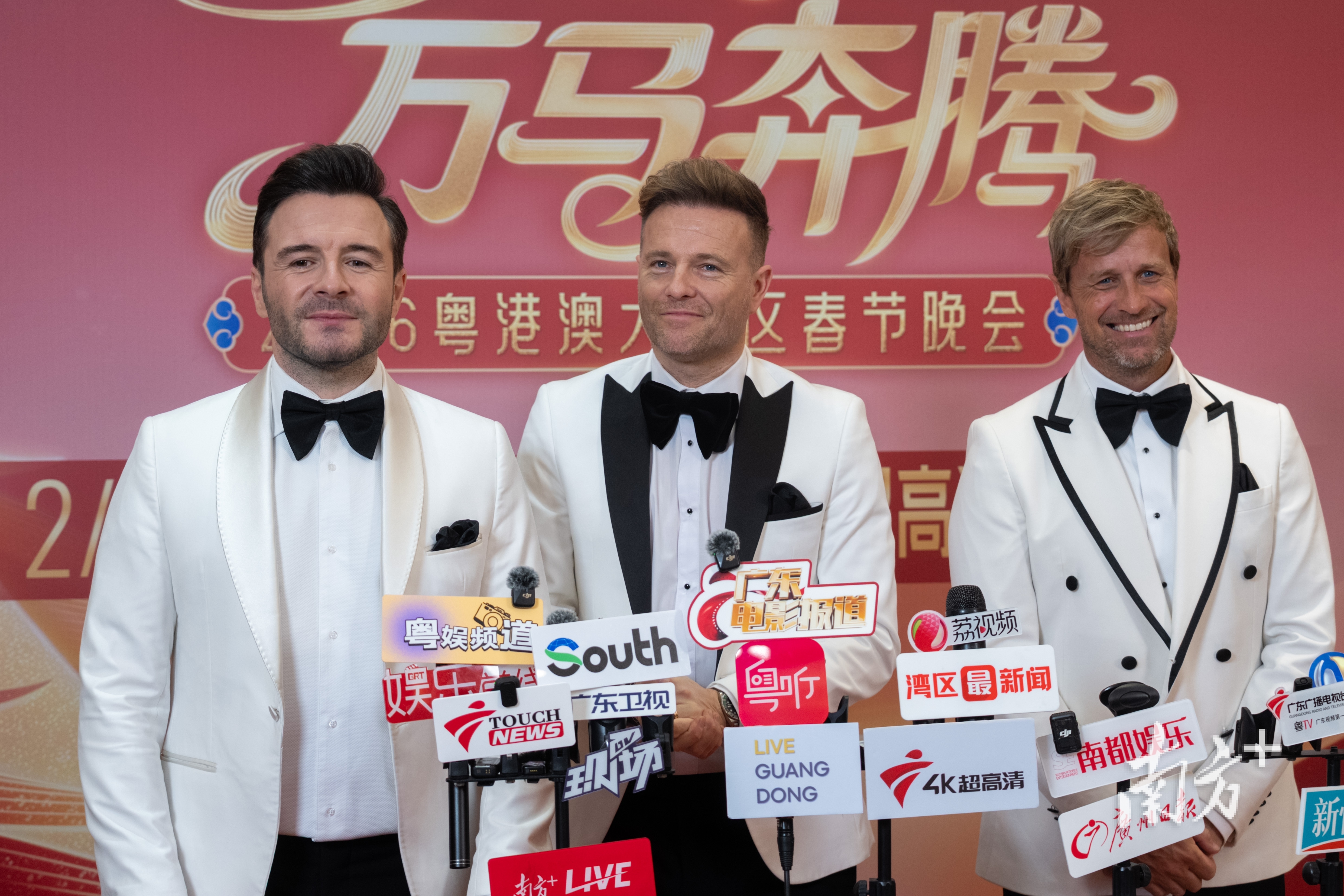 1月31日晚,爱尔兰著名男子演唱组合Westlife西城男孩现身广东卫视《驾势湾区 万马奔腾——2026粤港澳大湾区春节晚会》录制现场,带来《You Raise Me Up》《Swear It Again》两首经典歌曲,为大湾区观众送上了一份特别的春节祝福。