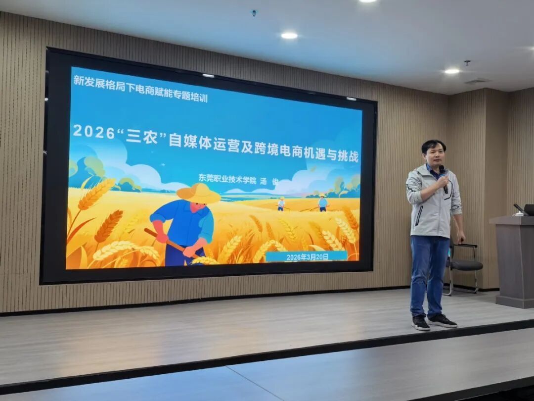 为深入推进乡村振兴战略,提升涉农主体数字化运营能力,拓宽农产品线上销售与跨境出海渠道,近日,由东莞市莞城街道驻揭阳市揭东区工作队主办,东莞职业技术学院协办的《电商赋能乡村振兴与跨境电商新发展——“三农”自媒体运营及2026跨境电商机遇挑战》专题培训,在揭阳市经开区产业服务中心一楼多功能厅举行。各驻镇工作队队长、队员及属地涉农企业代表参加本次培训,共同学习电商运营新技能。