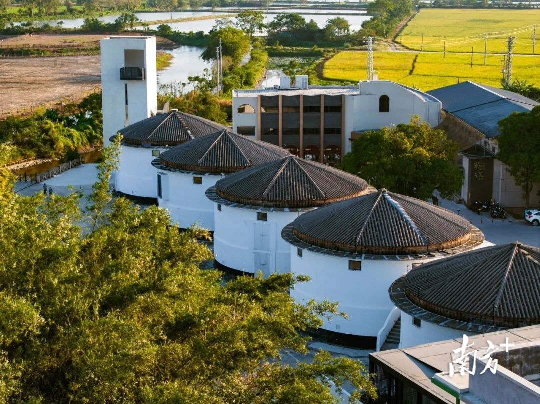 江门开平塘口镇,五座巨大的白色粮仓屹立在稻田中央,与附近庄重肃穆的百年碉楼群,共同组成了一幅错落有致的乡村景观图。