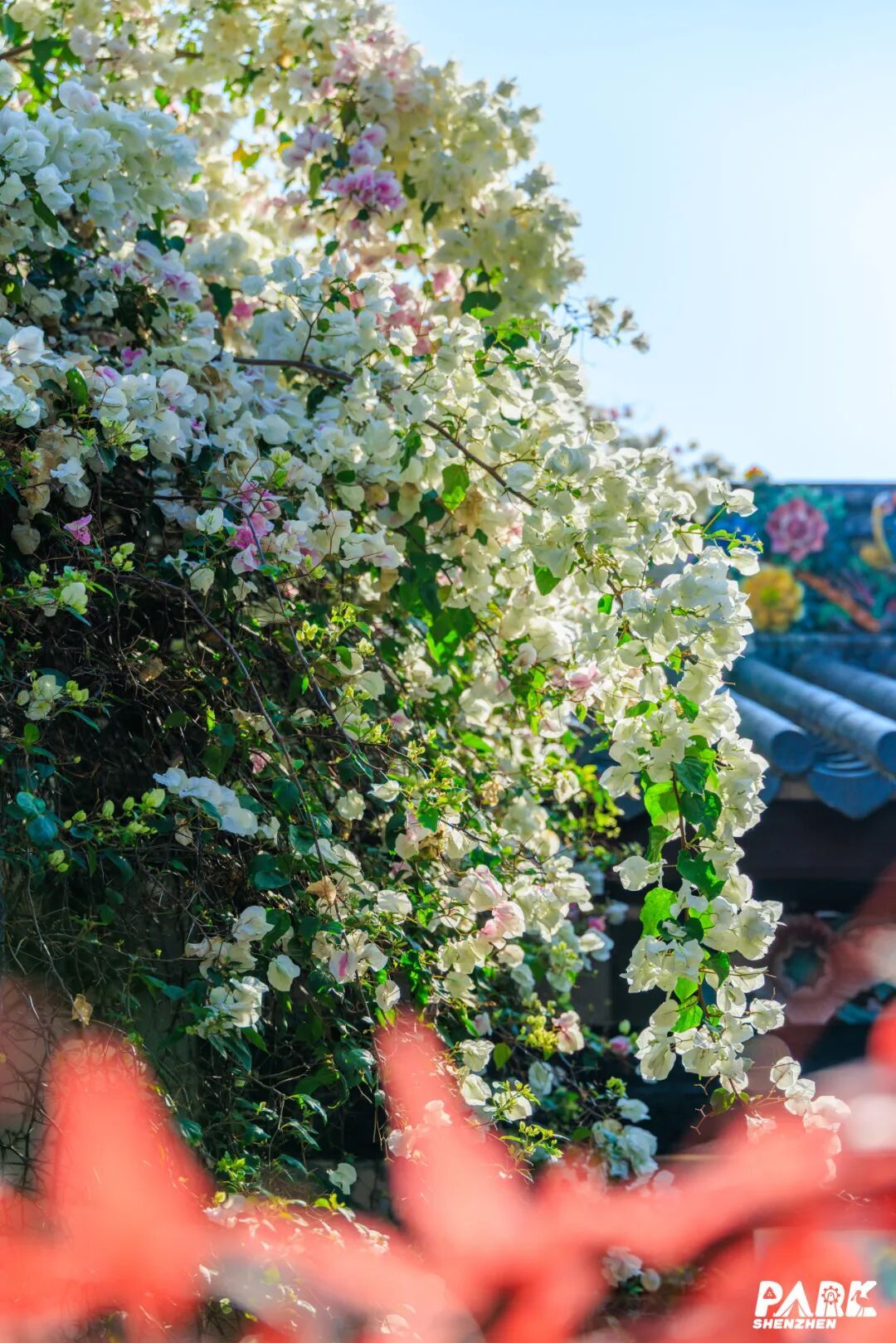 白色、粉色的花枝如瀑布般爬满墙头